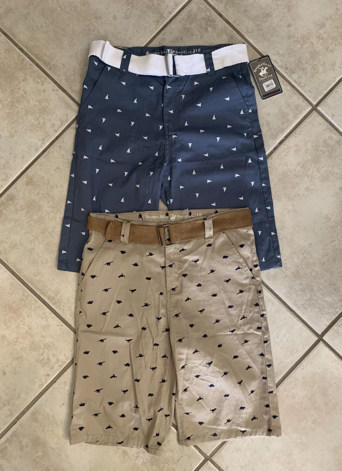New boys size 18 Polo Club shorts with belts. Blue shorts have sail boats/Beige shorts have dinosaurs🦖 $25 for both, or $14 each 2 shorts and 2 belts