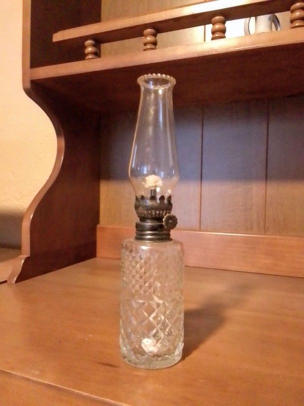 A vintage, desk-size glass kerosene hurricane lamp. Height is exactly 10 inches. Lamp is roughly 35-40 years old; In perfect, like-new condition-- never been used or filled.