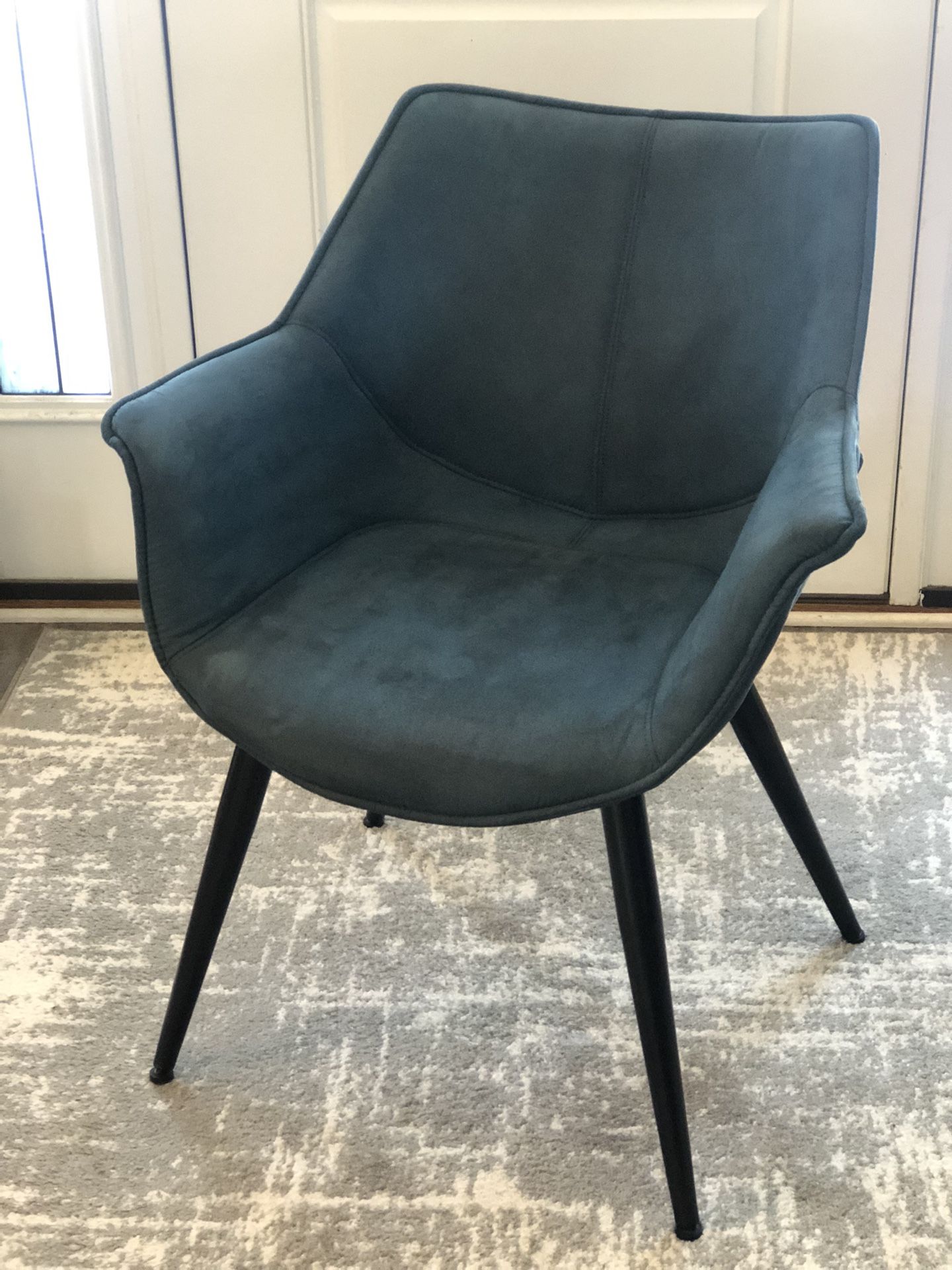 Wrangler/Accent Chair Color: Teal Upholstered in Suede-Like Polyester Fabric. Black Metal Legs. On the inside of one of the legs there is black paint gone-see last picture. You can’t see it unless you tip the chair upside down. Industrial Styling Flared Armrest. Cushioned Seat and Backrest. Width is 22 Inches Height is 32 Inches Seat Depth is 18 Inches Great for Living Room, Den, Bedroom, or Office. Available for pickup at my house in Oswego, IL. Ogden Falls Subdivision. I take Cash or Zelle.