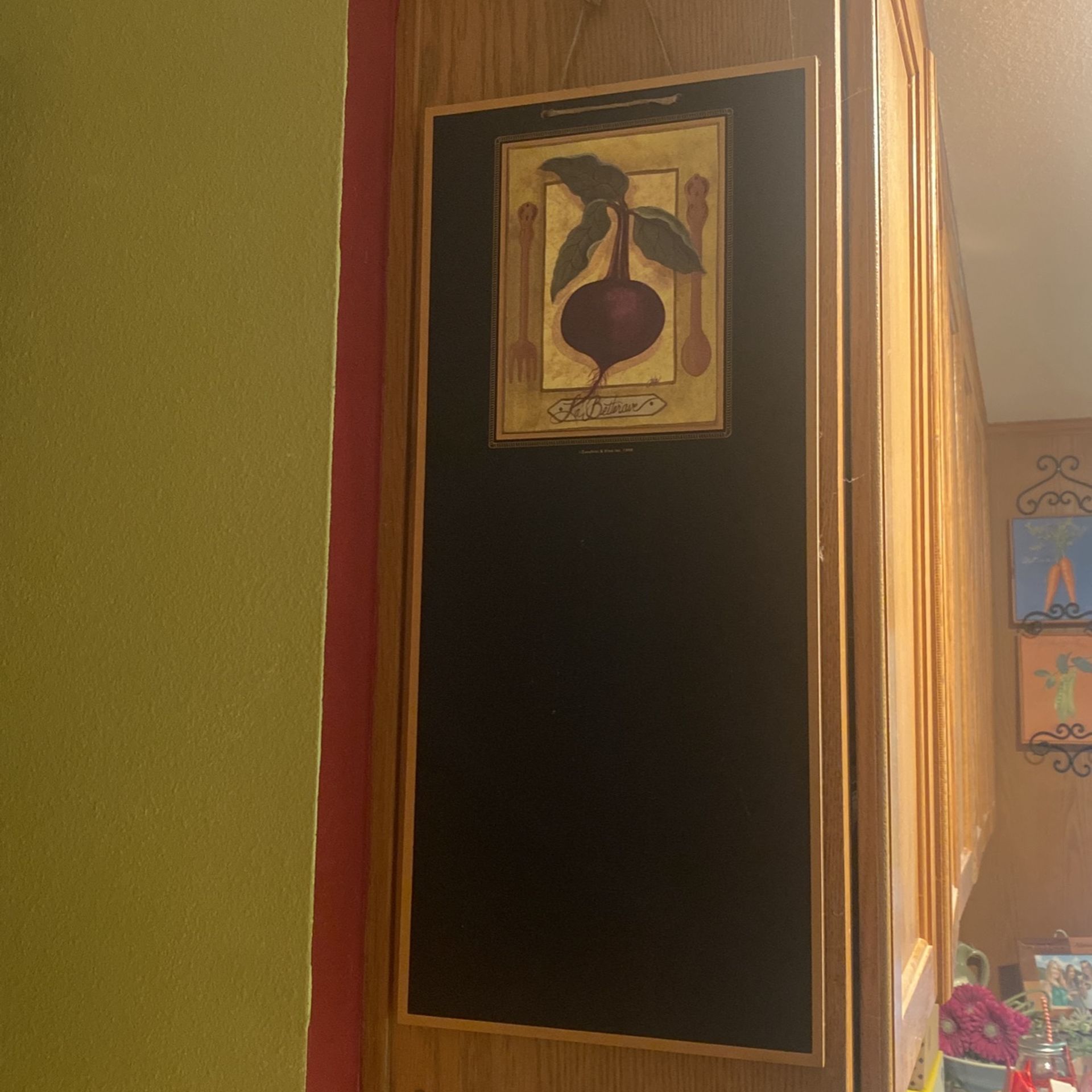 Never used decorative kitchen blackboard/message board. Radish design on black board 24” tall x 10 1/2” wide