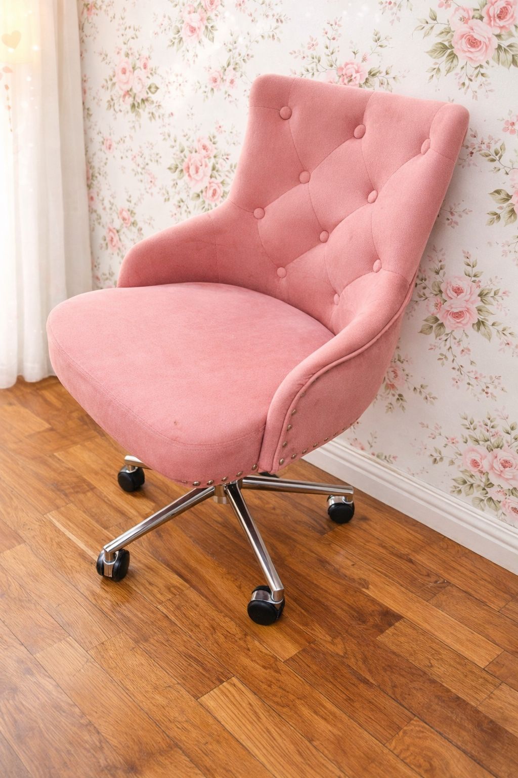 Pink Velvet Tufted Swivel Desk Chair – Adjustable Office / Vanity Chair