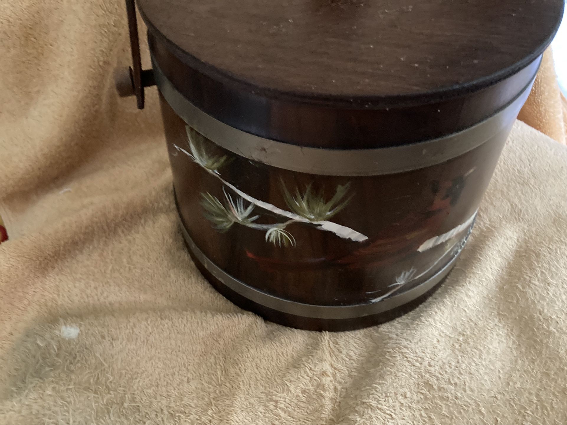 Wooden w/ a hand painted cardinal medium stain plastic lining handle 8.5” diameter x 7.5”h marked Basketville