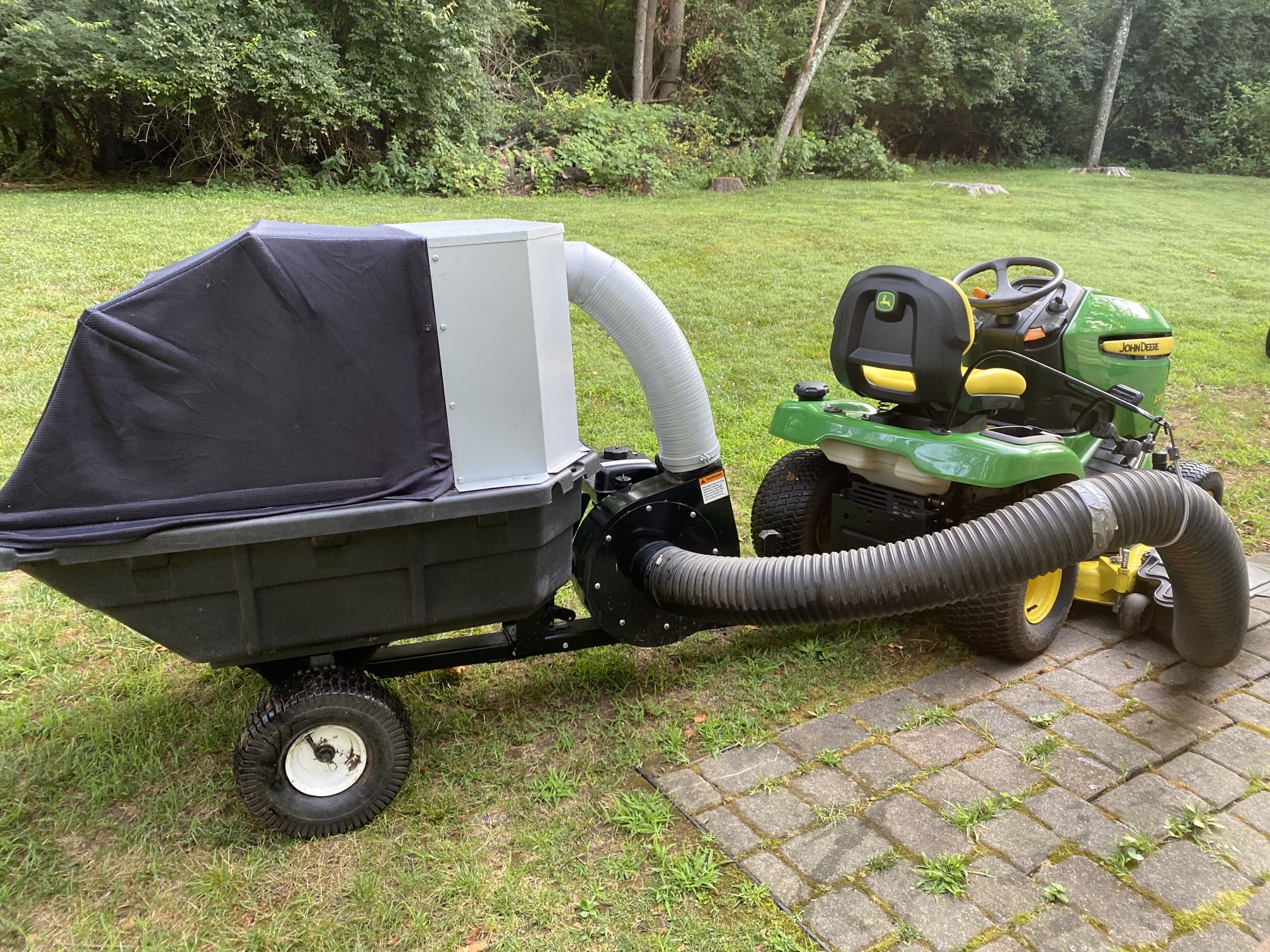 For sale Great condition Pull behind Trail Vac grass leaf lawn grass vacuum Was used on John Deere X series tractor 48” deck but may fit on other decks. Universal adapters available online for any deck type or size Similar to Agra Fab Cyclone DR 20 cu ft capacity 6.5 Briggs engine runs great