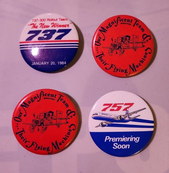 VINTAGE Lot Of 1980s BOEING PINBACK PINs Buttons “OUR MAGNIFICENT TEAM & THEIR FLYING MACHINES" & 737-300 ROLLOUT TEAM & 757 PREMIERING SOON All four buttons are in fair condition, see photos. All four buttons for one low price. $21 or best offer, please don't hesitate. You won't hurt my feelings with a low price. Discount of at least 10% if you buy more than one posted item. Will meet in Kent, Auburn or Renton Valley Area. Any questions or concerns please message through OfferUp. Thanks BX30
