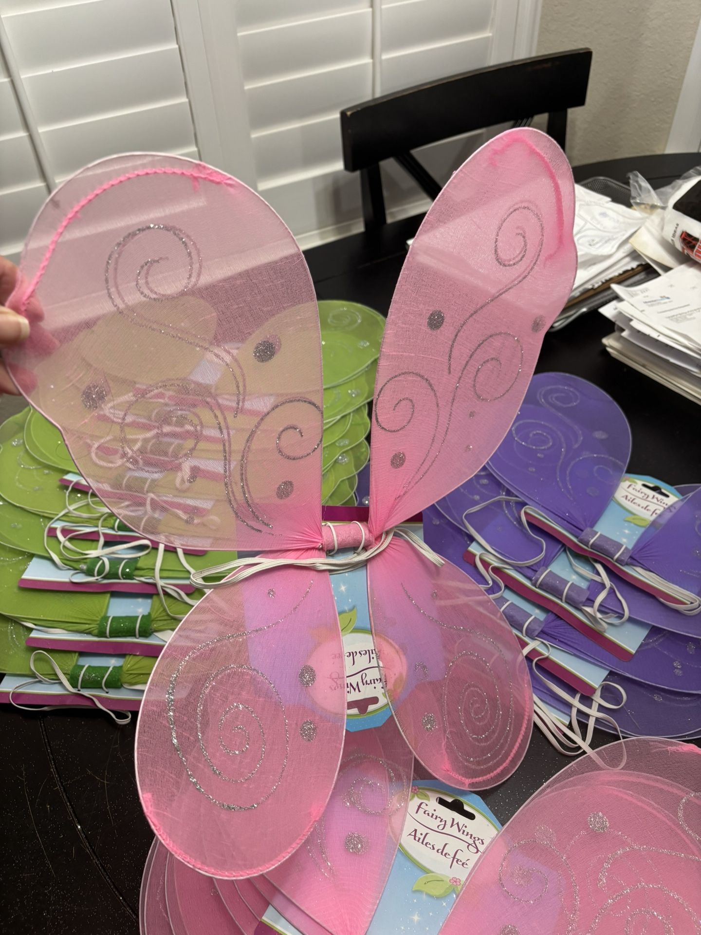 17 Brand new Fairy wings in pink, green and purple…all with a little glitter. 5 pink wings, 8 green wings and 4 purple wings. Bought them at the dollar tree a few years ago for my daughter’s tinker bell birthday party. They have elastic on both ends so they can wear around both arms. You can also use as decorations or on the back of chairs.