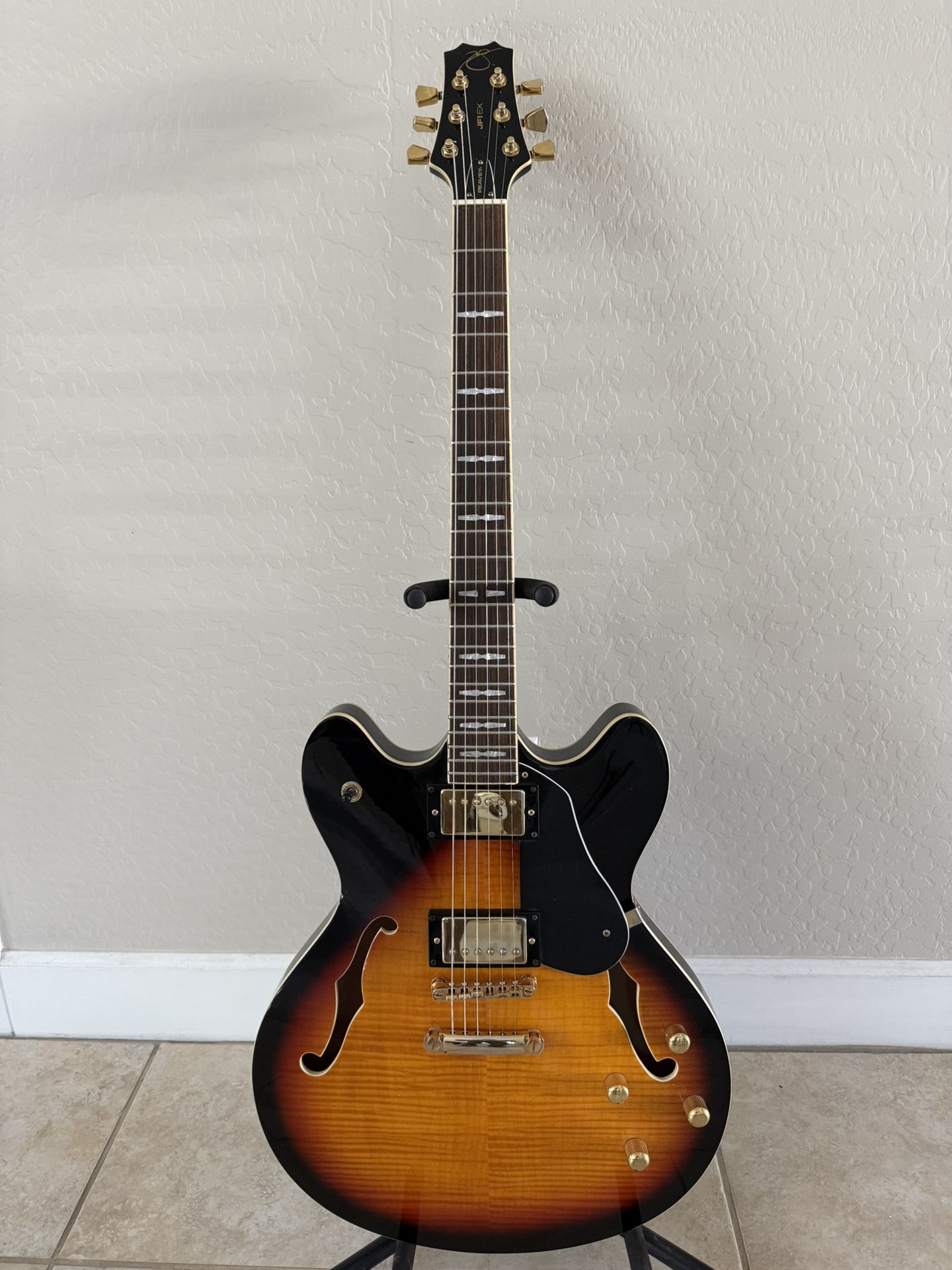Cool little semi hollow body guitar. Recently gone through and everything plays and sounds fantastic! Great condition, just looking for a new home. Any questions please ask. Thanks!
