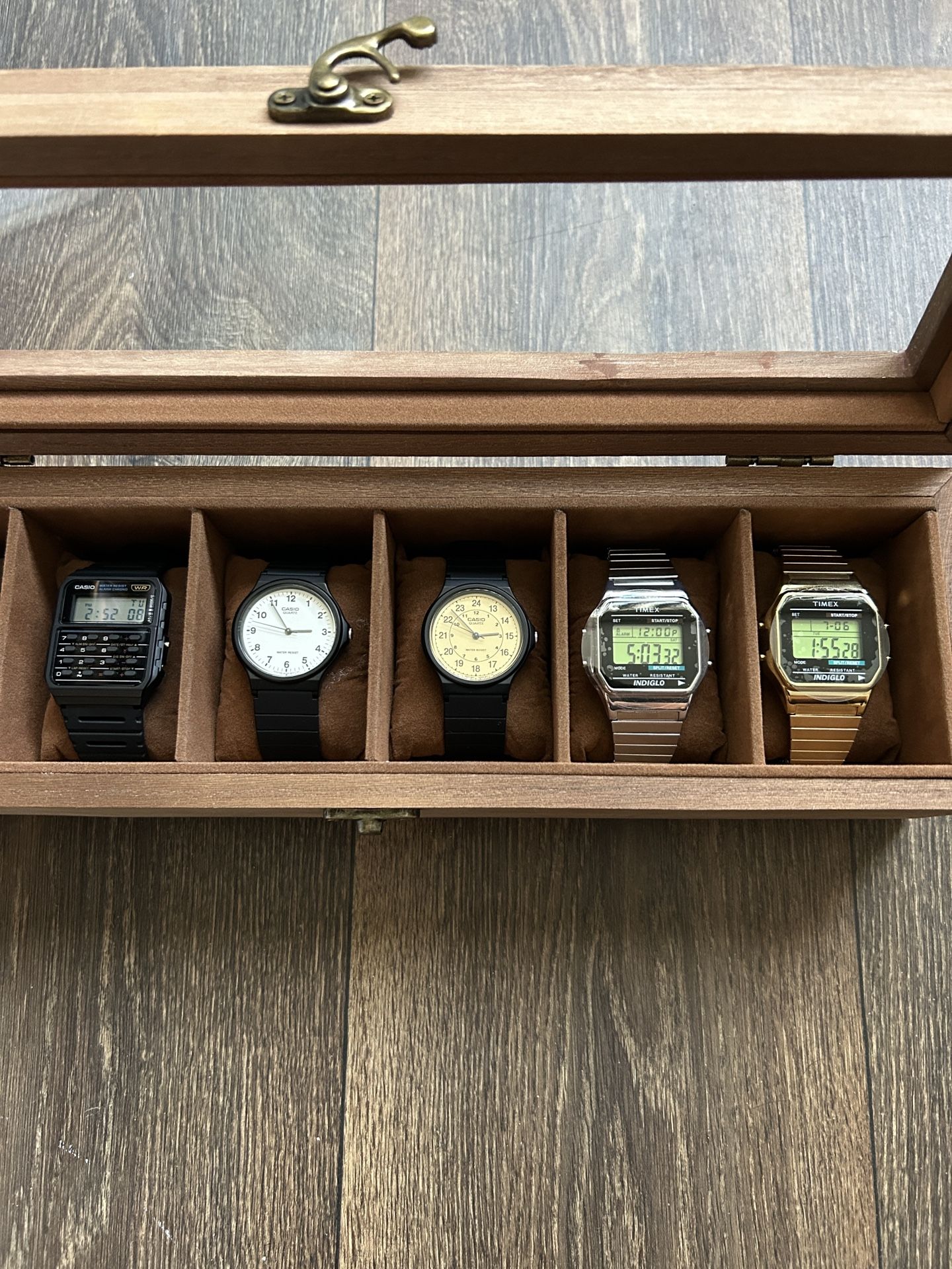 Casio watches with a wooden watch box All Brand New. Never used