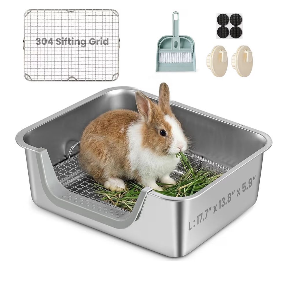 Rabbit Litter Box, Extra Large Bunny Litter Box with 304 Stainless Steel Sifting Grid, Safe Plastic-Covered Entry Edge & Hooks, Easy to Clean and Odor