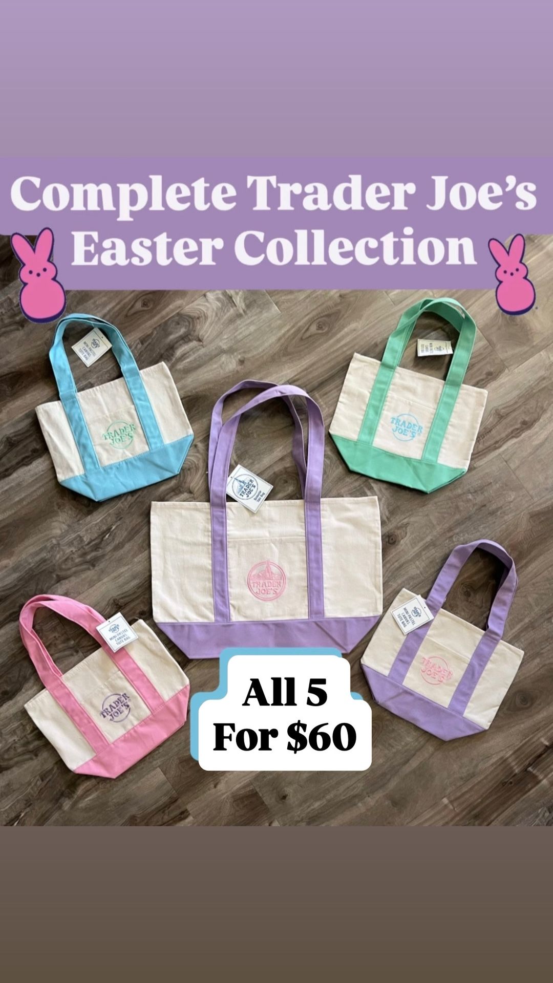 1 large lavender TJ tote + 4 mini TJ totes= 5 bags total I have the complete Halloween and Easter colors: Lavender, pink, baby blue, green, black, purple, orange, multi-color. You can keep an original receipt with this purchase. $60 firm Pick up San Gabriel area Cash Only