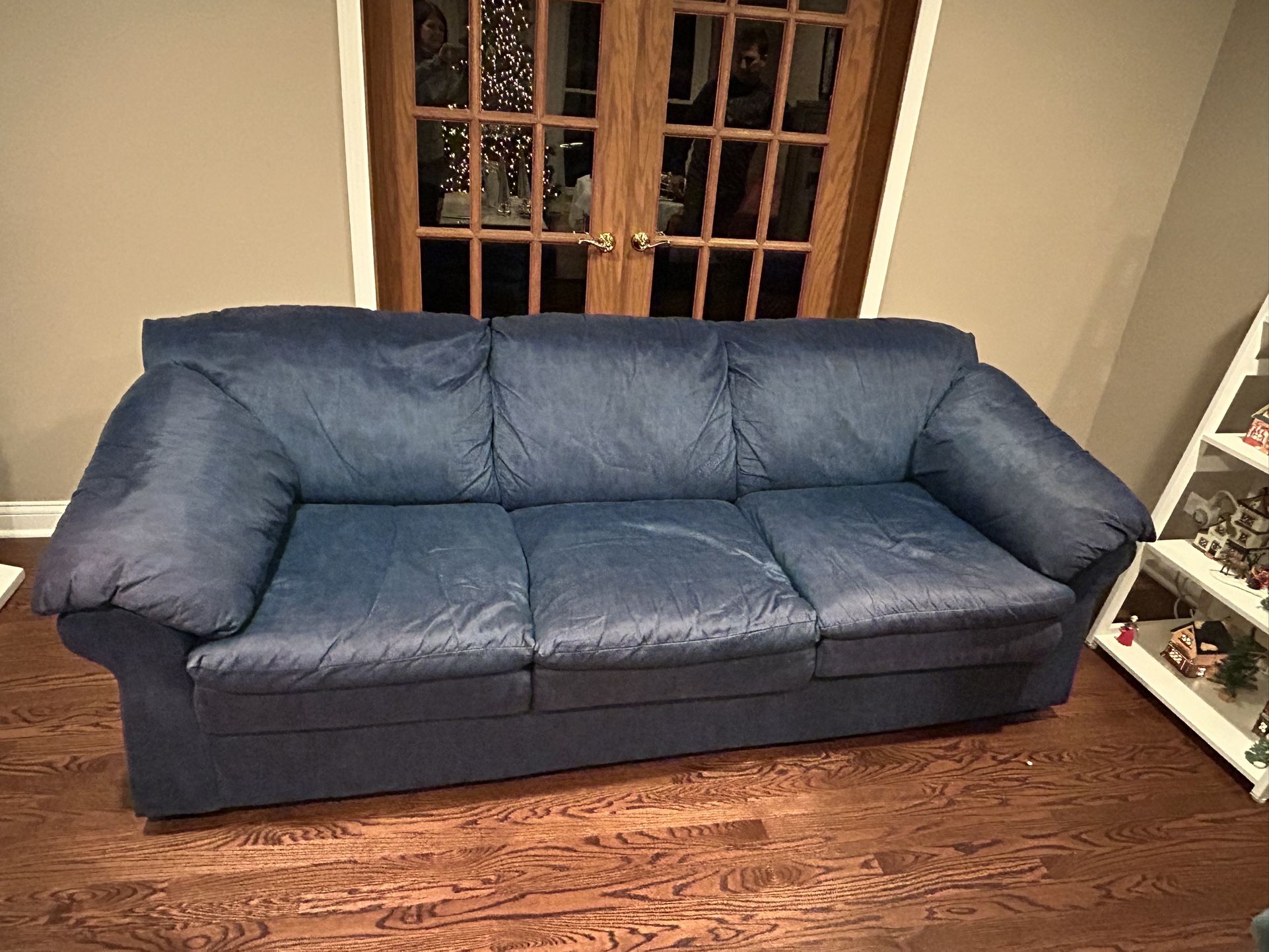 Marching set. Blue. Stationary back cushions. Smoke free, pet free home. No rips or tears. Some sun fading. Couch is 92” arm to arm Loveseat is 66” arm to arm Must pick up in Darien. Price is for both pieces.