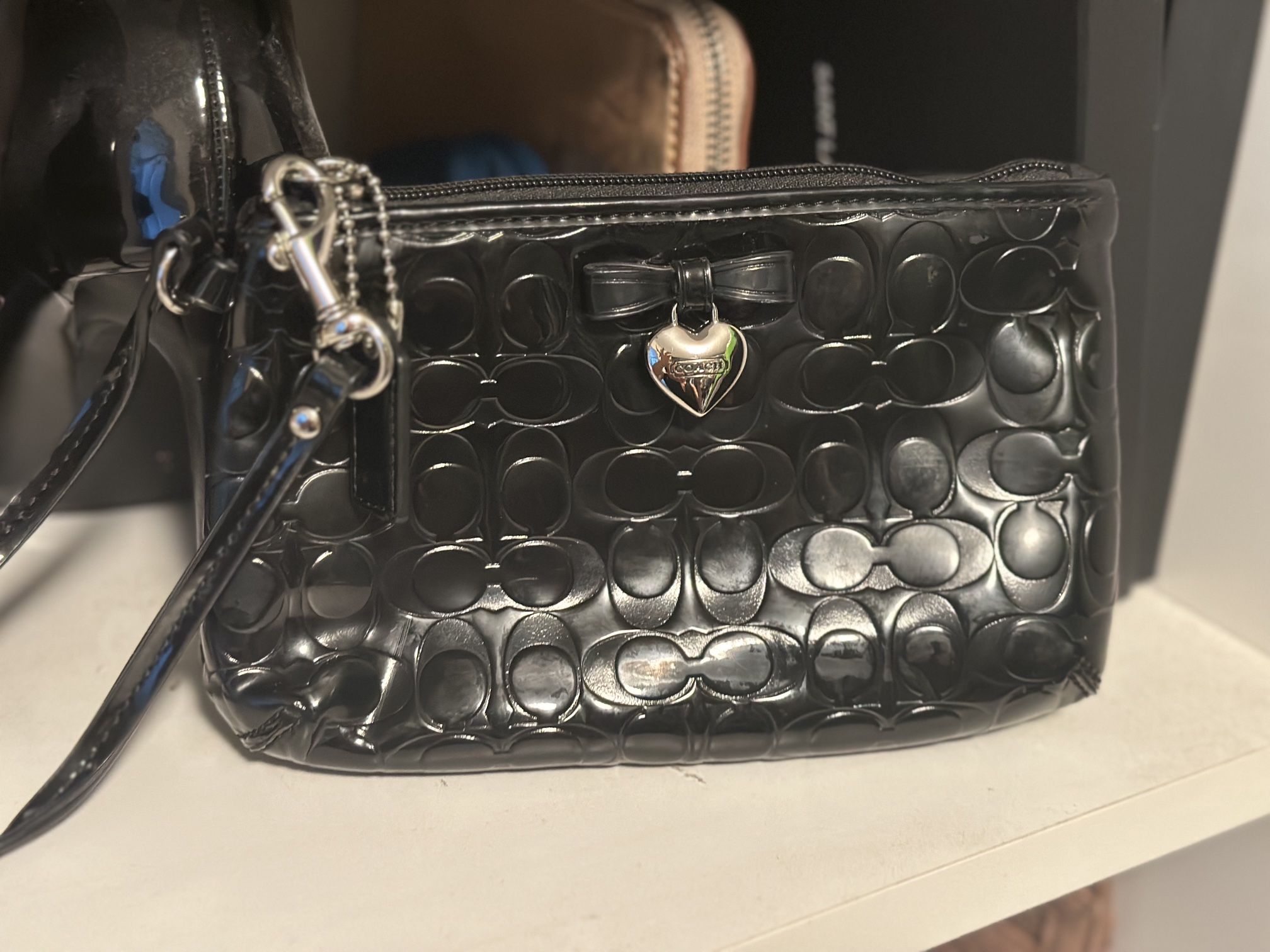 Beautiful black wristlet with a silver heart with the brand name COACH on it. Very dainty and perfect for a date or running around.