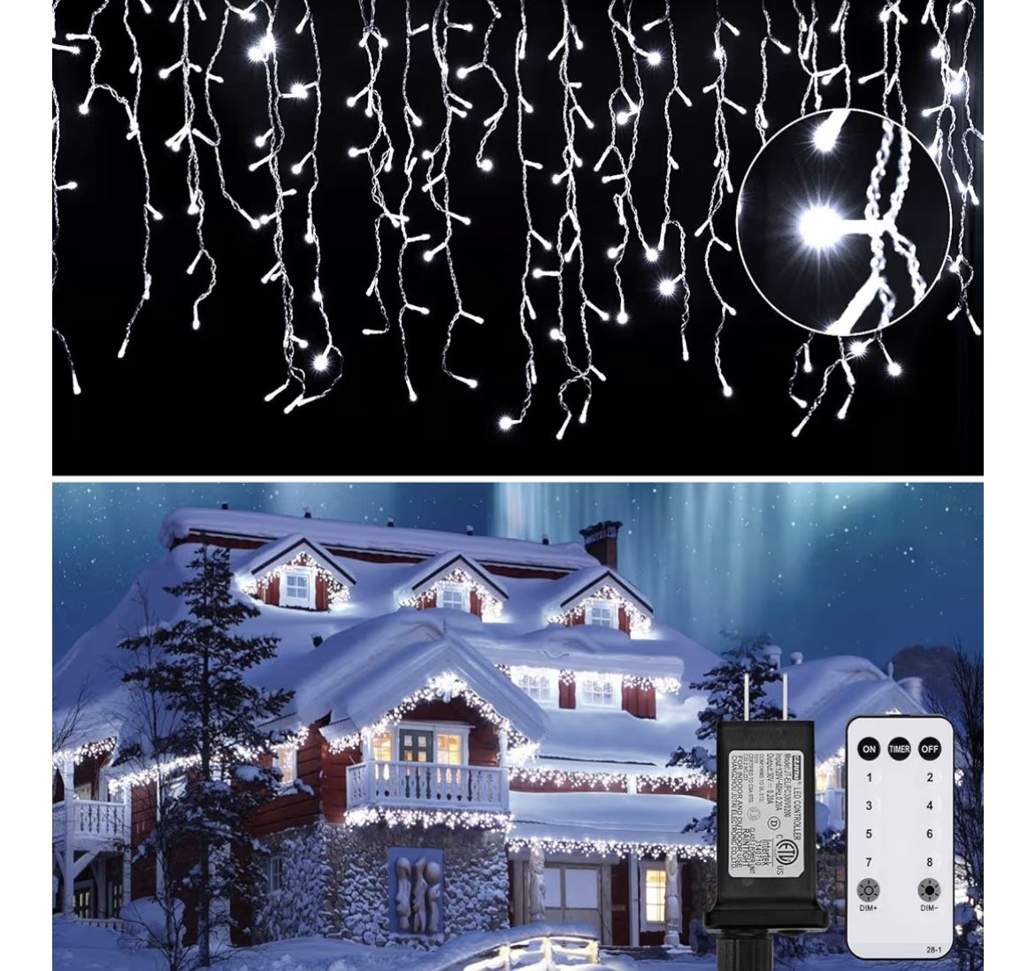 Outdoor LED icicle string lights with remote control. Icicle Christmas Lights Outdoor, 40Ft 432 LED Waterproof White Icicle Lights for Outside, 8 Lighting Modes Connectable String Light with Remote,Timer, 81 Drops Christmas Decorations for House. I have 2 left this come with control. Cool white color !!! $35 each box