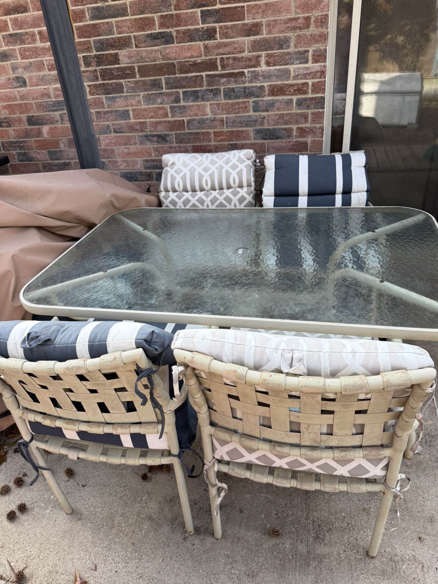 glass-top outdoor patio dining set, including a rectangular table and 4 chairs with cushions. OBO need gone asap