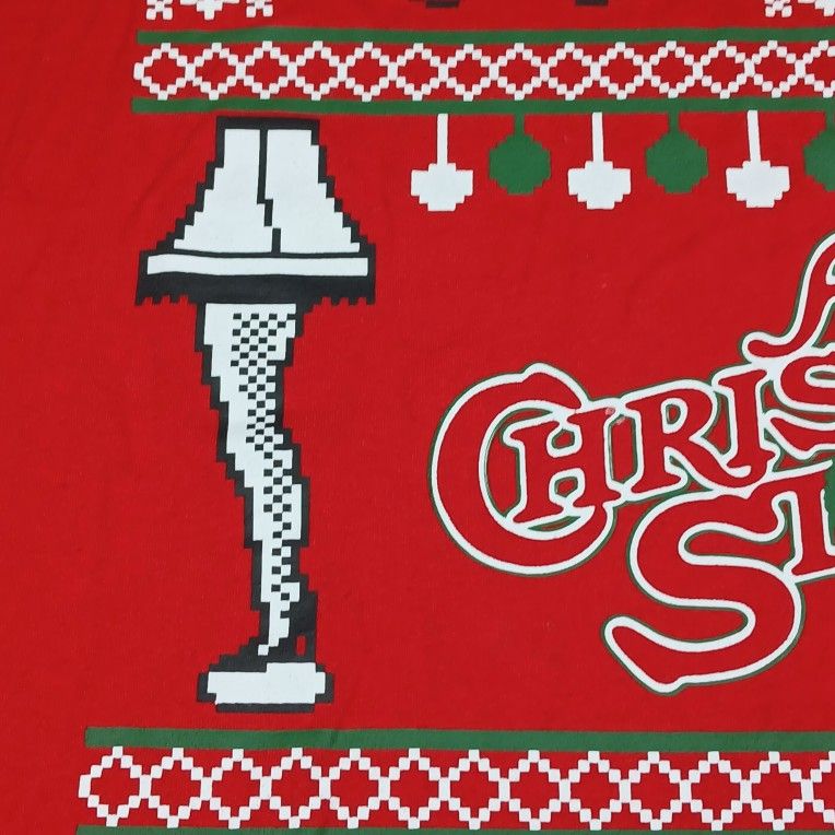 This 2XL Adult A Christmas Story Leg Lamp Broken Glasses Red T-Shirt is a solid red shirt featuring a classic crew neck and short sleeves. Made from a comfortable blend of polyester and cotton, this knit shirt is machine washable and easy to care for. The shirt showcases a funny and festive theme inspired by the holiday movie "A Christmas Story," making it a unique and entertaining addition to any man's wardrobe. Perfect for fans of the movie or anyone looking to add a touch of humor to their outfit. Preowned condition with lots of life left. Please review pictures. Please feel free to ask questions. Thank you Featuring icons from A Christmas Story, such as the leg lamp, broken glasses, and holiday accents, the print offers more detail than standard lounge shirts. The bold lettering with a wreath replacing the "O" in "Story" makes the design recognizable