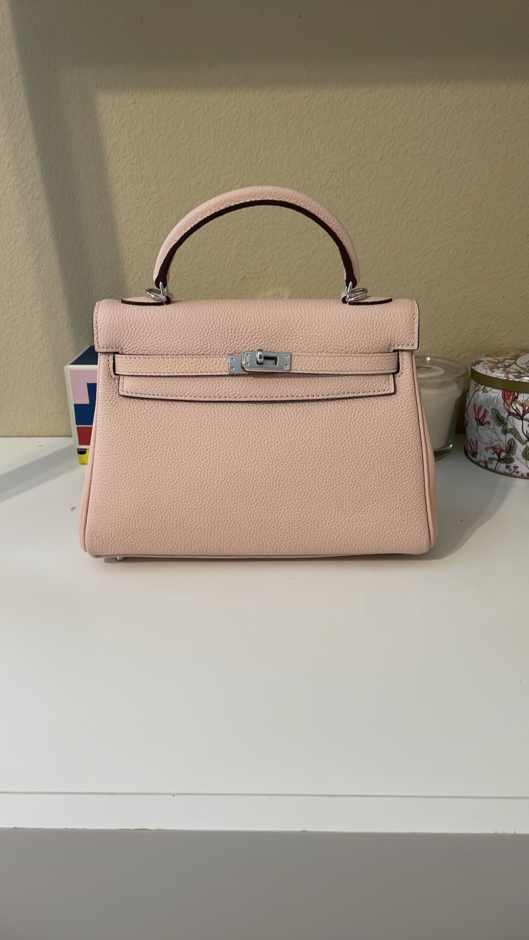 Summerly color! No logo, stamp or material tag. 25cm x 20cm x 12cm Full grain pebbled leather outer in light pink with silver toned hardware. Comes with a shoulder strap, lock, key and dust bag. This one does not have a clochette. Minor imperfections along the edges of the belt. See pictures for details.