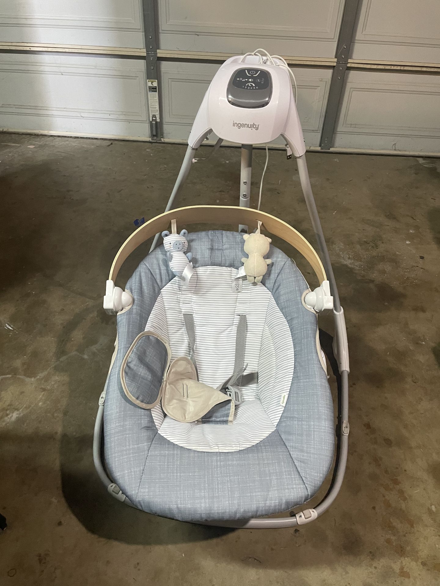 Gently used Ingenuity baby swing in great condition. Features multiple swing speeds (1–6), built-in soothing music and sound options, and a timer setting (15, 20, or 30 minutes). Includes a soft, comfortable seat with secure harness and adorable hanging toys to keep baby entertained. Sturdy, clean, and works perfectly. Great for soothing little ones hands-free! Pickup only. Message me if interested