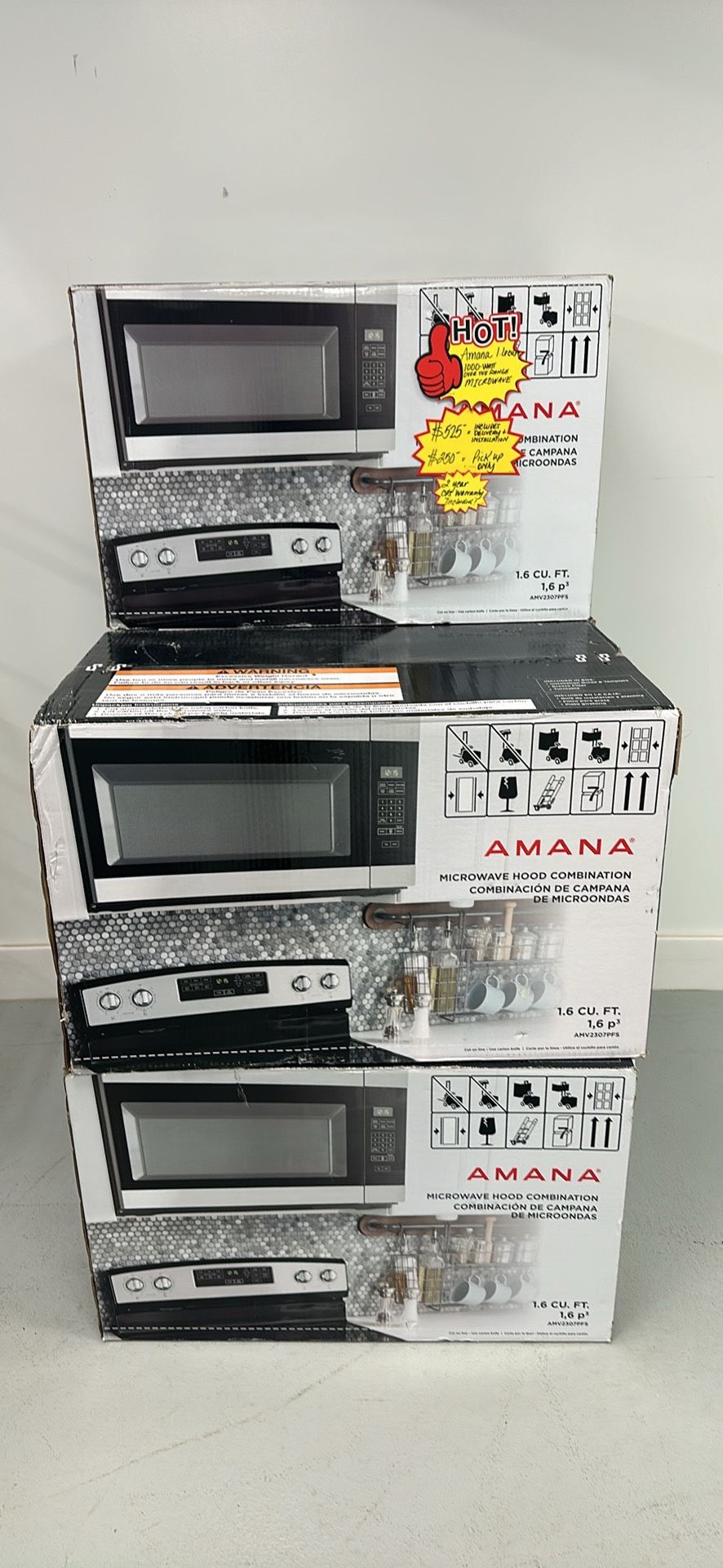 If you need delivery and installation total price $525 ✨✨✨✨Introducing the brand new Amana Over-the-Range Microwave, a sleek and powerful addition to any kitchen. With a generous capacity of 1.6 cubic feet and a robust 1,000 watts of cooking power, this microwave is designed to handle all your culinary needs with ease. Fresh out of the box, this Amana microwave boasts impeccable condition and unbeatable value, making it a must-have for any budget-conscious shopper. Whether you're reheating leftovers, defrosting ingredients, or cooking a quick meal, this microwave delivers consistent and reliable performance every time. With its over-the-range design, this microwave not only saves valuable counter space but also adds a touch of modernity to your kitchen decor. Say goodbye to cluttered countertops and hello to streamlined elegance. Don't miss out on the opportunity to bring home this exceptional Amana microwave at a great price. Upgrade your kitchen today and experience the convenience and efficiency of this top-quality appliance.