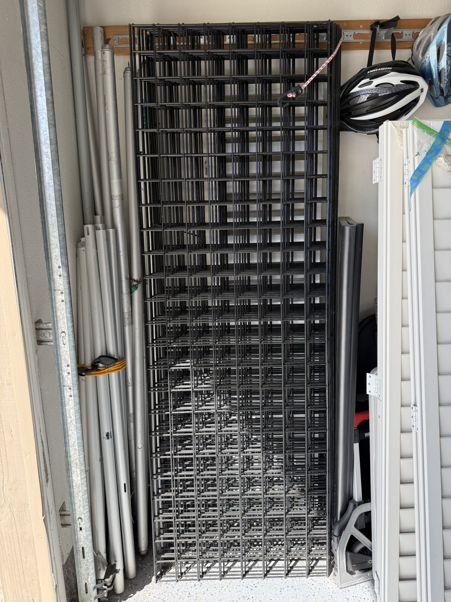 12 2’ x 6’ metal wire racks, 2 metal wire triangle corner racks, 2, 48”shelves, 2, 24” shelves with brackets, 13 black pegboard frames(approx. 22” x 27”) with hooks. 2 plastic bins and cart for transport. Selling all as bundle.