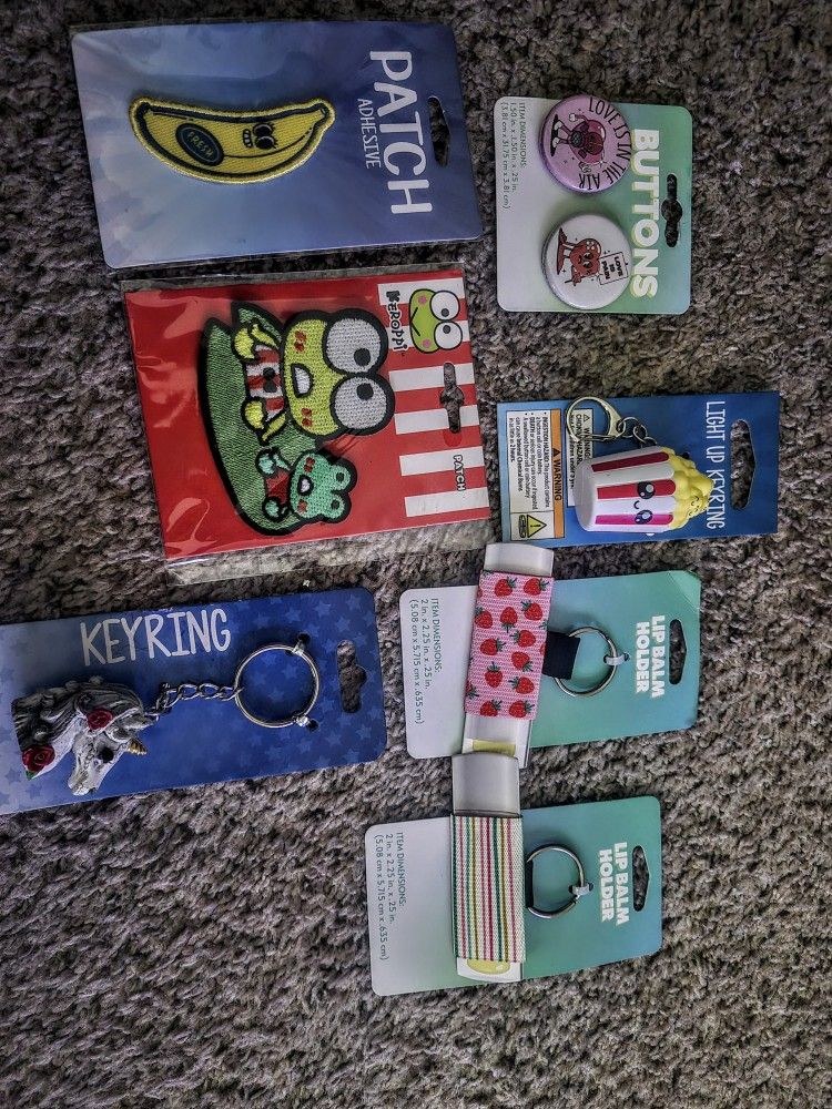 Love button pins 1.00 Keroppi patch 4.00 Banana adhesive patch 2.00 Popcorn bucket light up keychain 3.00 Gothic horse keychain 3.00 Lip balm holder keychains 2.00 Grey tassle keychain 2.00 All together 15.00