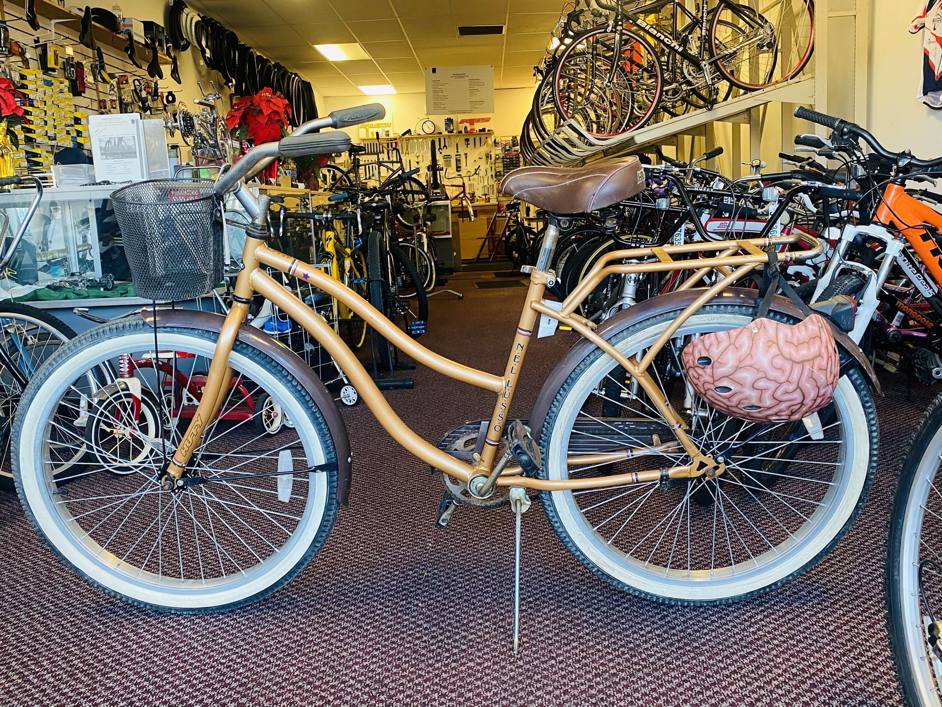 Huffy Nel Lusso 26” cruiser bike 26” wheels with wide whitewall tires • Single-speed with coaster brake (pedal backwards to stop) • Front wire basket for groceries or bags • Rear adjustable cargo rack