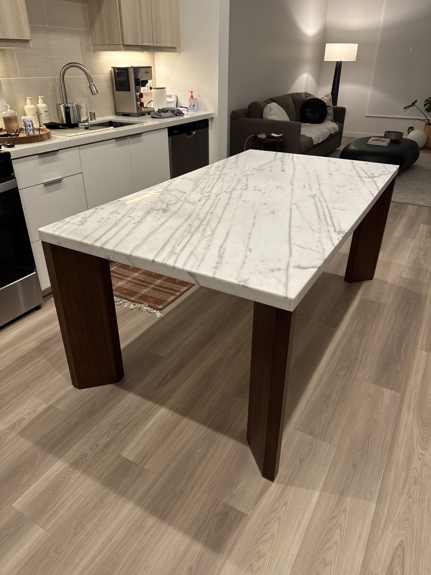 CB2 Dinning table Walnut wood legs Carrera marble top 6ft L x 3.5ft W X 2.5ft H Table only (no chairs) OBO