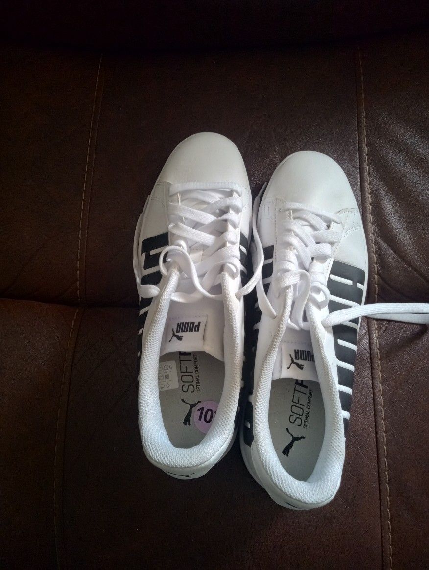 White Leather with Black writing Puma Tennis Shoes size 10.5 worn once in Good Condition $35.00