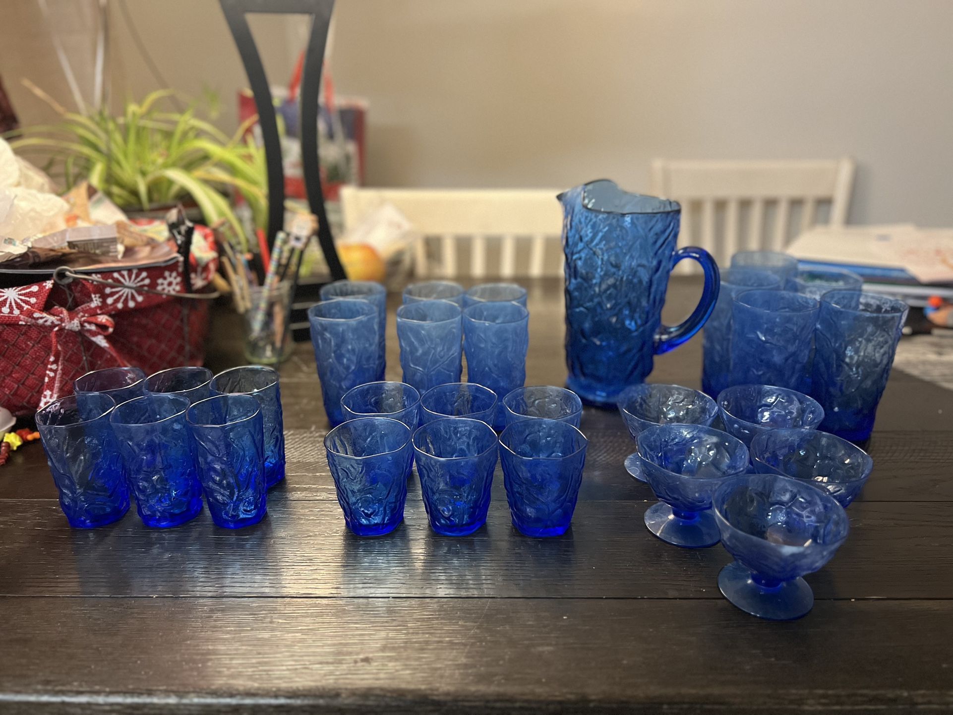 This is a set of Seneca Glass in the Driftwood Peacock Blue pattern from the 1950s. The set has a textured, "crinkle" or "cracked ice" finish. Will sell for $200/17 pieced set or separate sets for reasonable price Excellent condition This vintage glassware was manufactured in the United States.