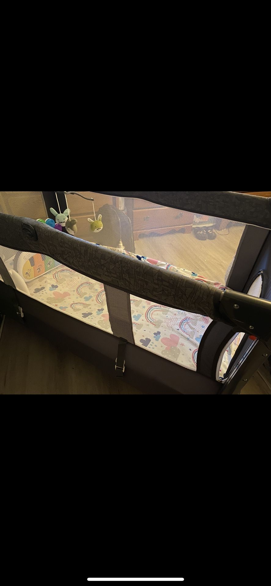 Adovel Bassinet Does not include mat to lay on. But does include attachable changing table. One side does move up and down for easy transition for baby Asking $80