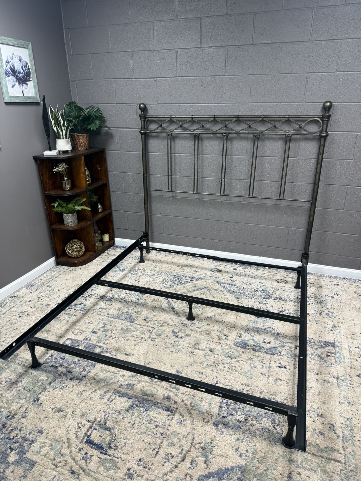 Queen Size Bed Frame. Includes an iron headboard Message me if interested. Ask about delivery if needed. Check out my other listing for all of your furniture/ household needs