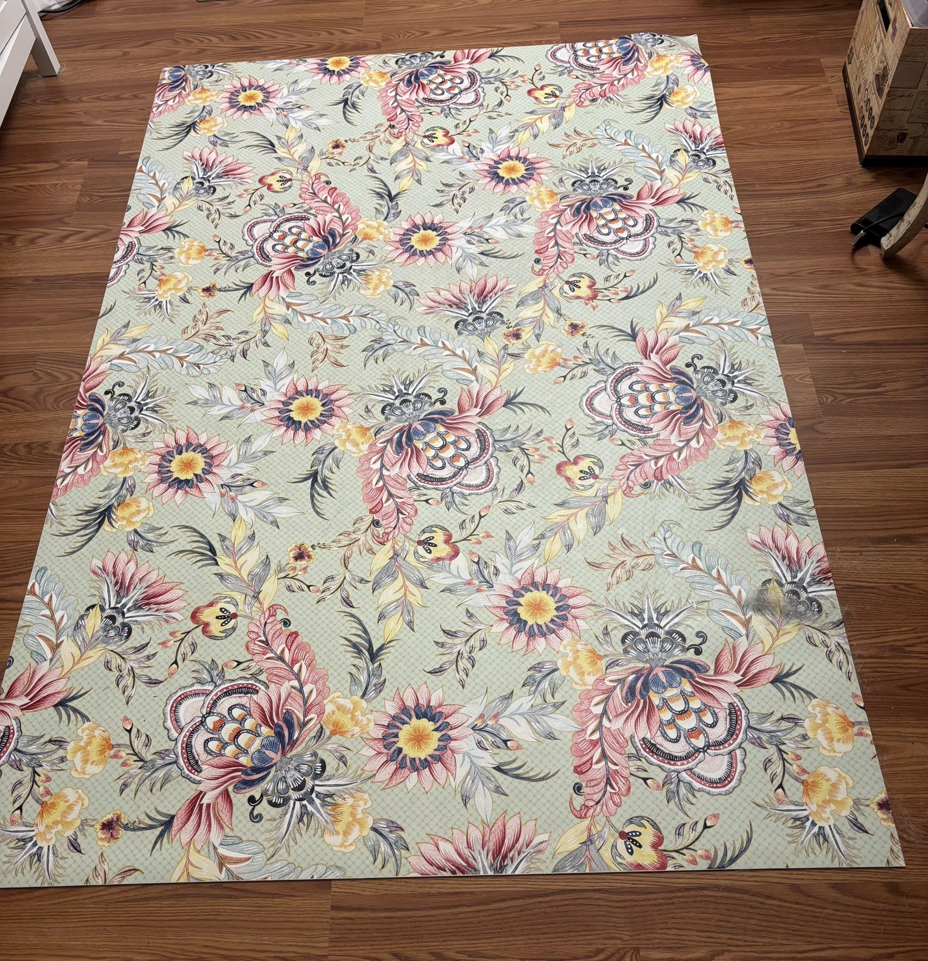 Colorful vinyl floor mat. High quality PVC. “Minty” green in color. Measurements: 47.2” W x 70.9” L In excellent condition. Anti-slip, stain-resistant, easy to clean, hypoallergenic, kid-friendly and pet-friendly. Flat, with no piles or fibers – which means spills and stains can be easily removed by using wet cloth. Durable, and can help protect your flooring from scratches as well as common wear and tear. This size typically sells for $260.