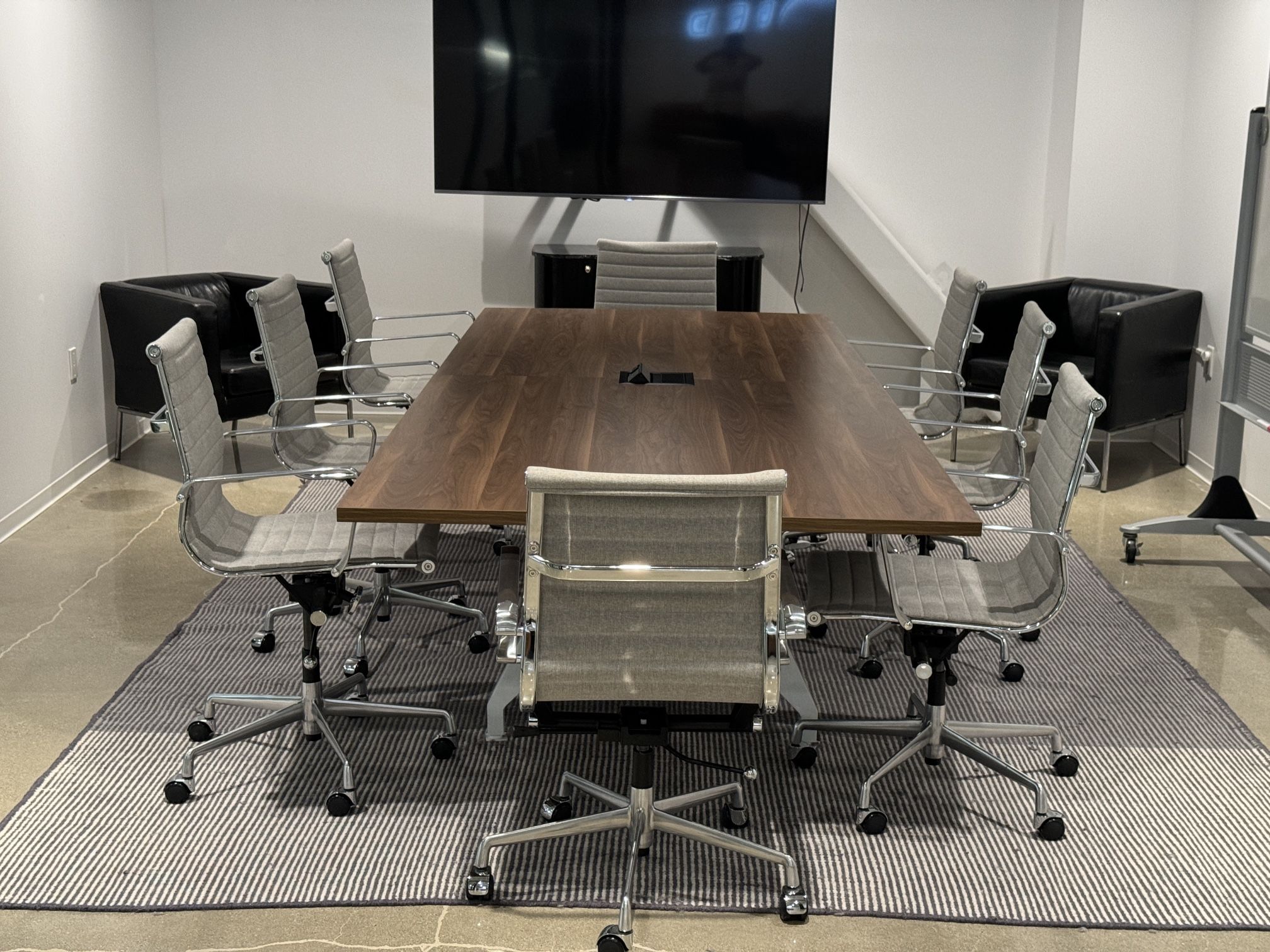 Beautiful modern conference room table equipped to support up to 10 people. Commercial grade walnut laminate table top with white metal base frame. No scratches. This table is in near perfect condition. Purchase brand new in 2022 but only used a handful of times. Only selling because we’re moving out of our current office. The ThinkTank Conference Table combines clean, modern lines with a unique signature base to create the ideal meeting destination, while built in power outlets and data ports to keep your devices powered and easily connect to TV monitor for presentations. Table dimensions: 120” L x 48” W (Table top can be separated into two separate pieces) keywords: steelcase , herman miller , meeting , executive , boardroom , office furniture , coworking , co-working , solid wood , steel , conference room , mid-century modern