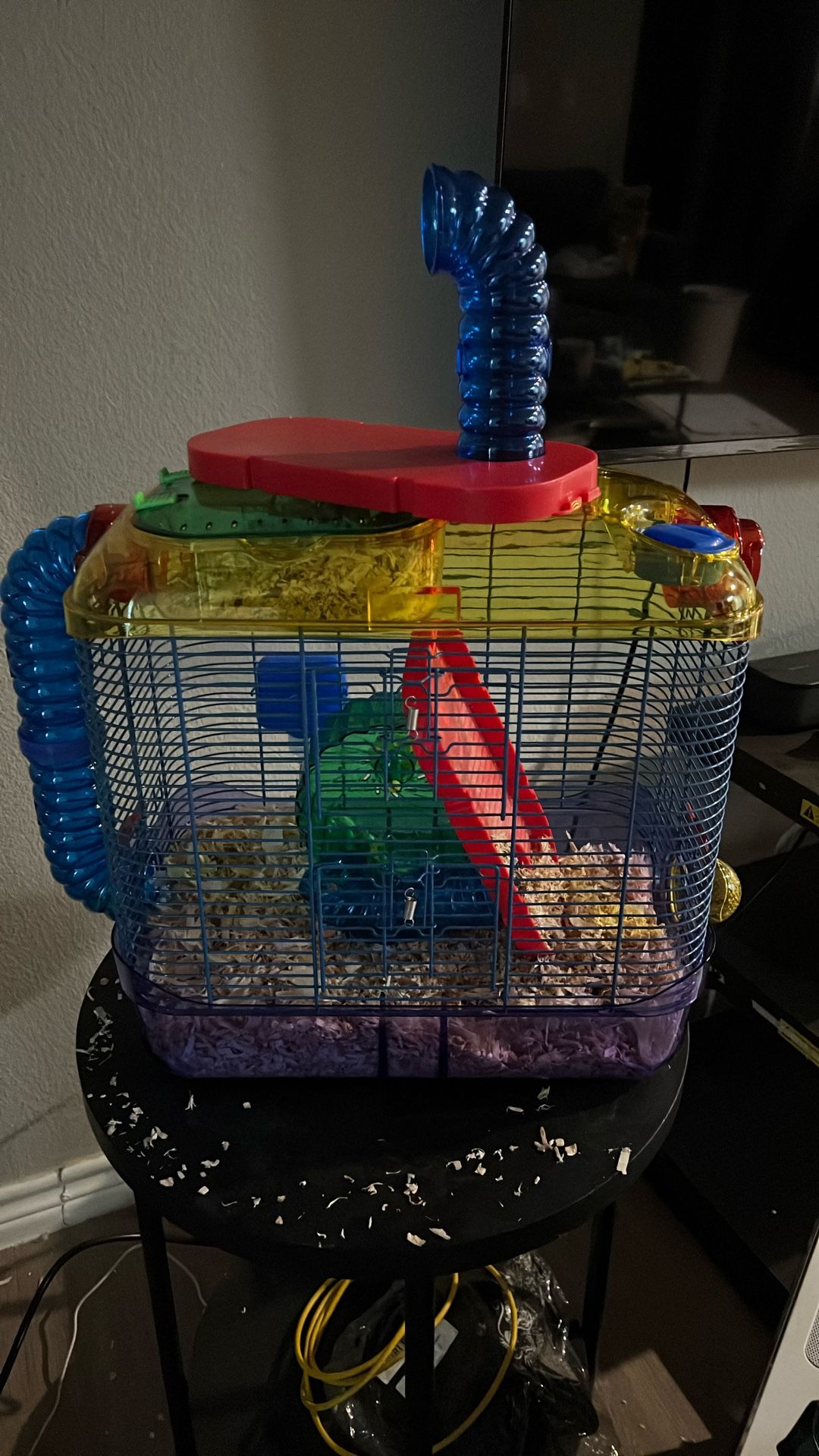 3 story hamster cage with built in carrying compartment that comes with all platforms, wheel, water bottle, and tubes.