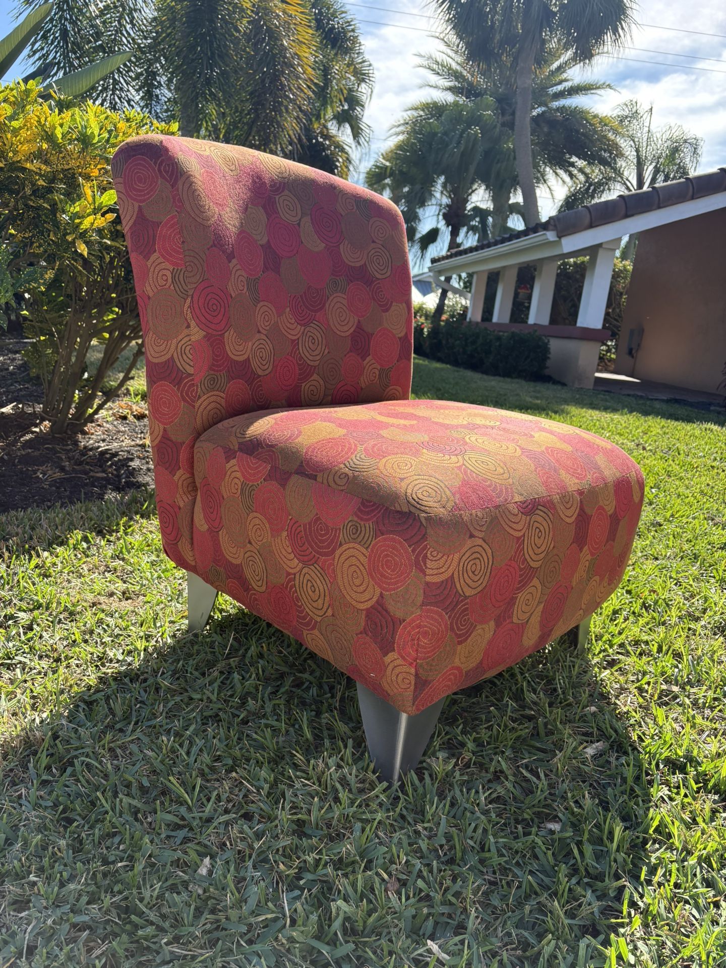This is a beautiful comfy chair. We bought it for our living room but we have low ceilings and the chair is too chunky. We tried lower legs but still is not a good fit. Original cost was $629. Chair height 36 in Seat width 28 in Seat height 17 in