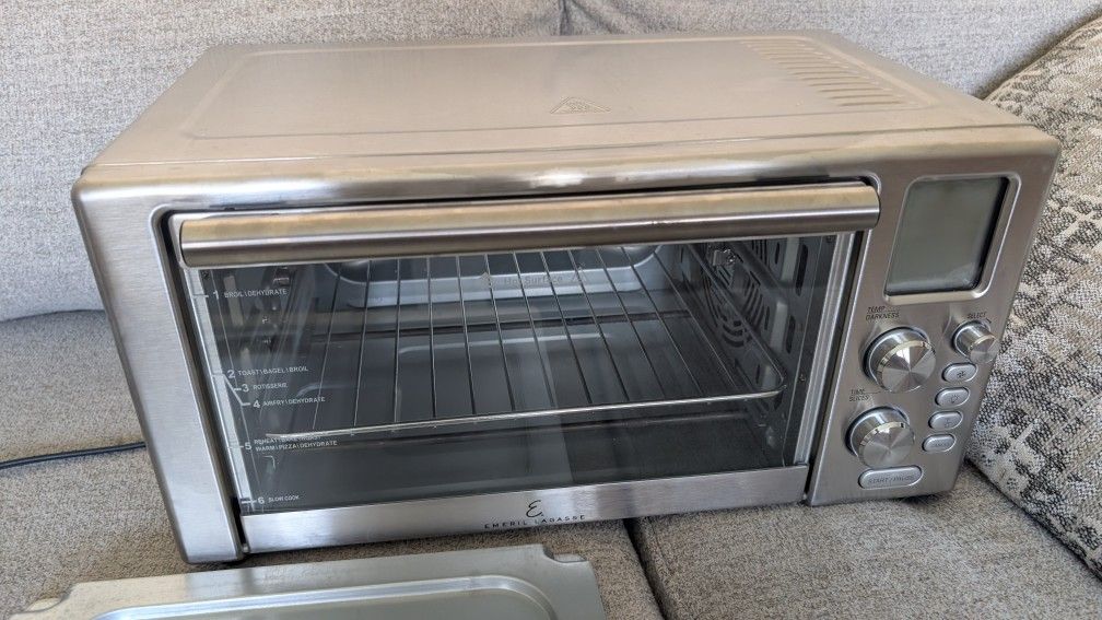 Used only once. Emeril Lagasse air fryer with 3 trays and turn spit for rotisserie.