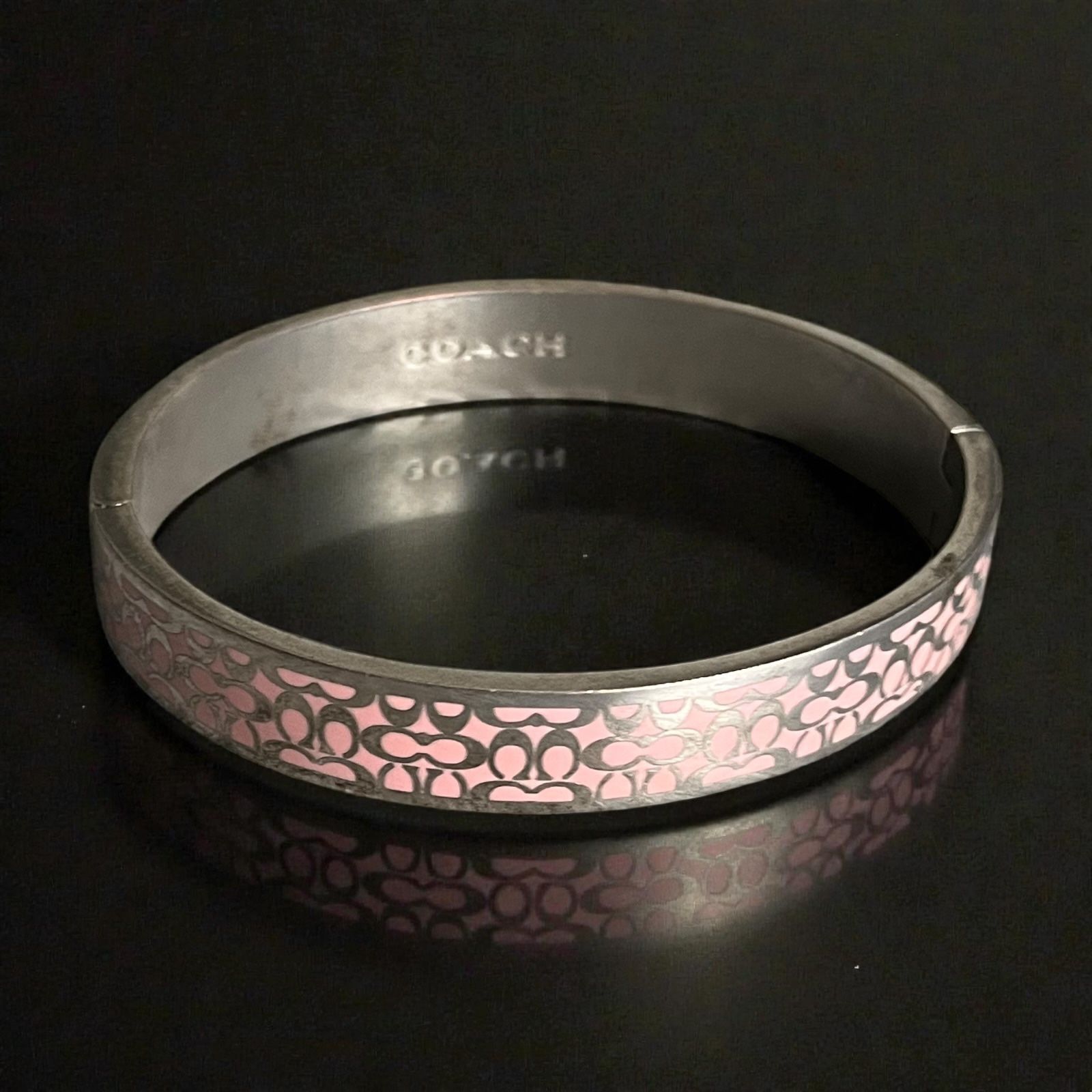 COACH SILVER TONE SIGNATURE PINK/SILVER ENAMEL BANGLE BRACELET WOMENS 7 1/2”