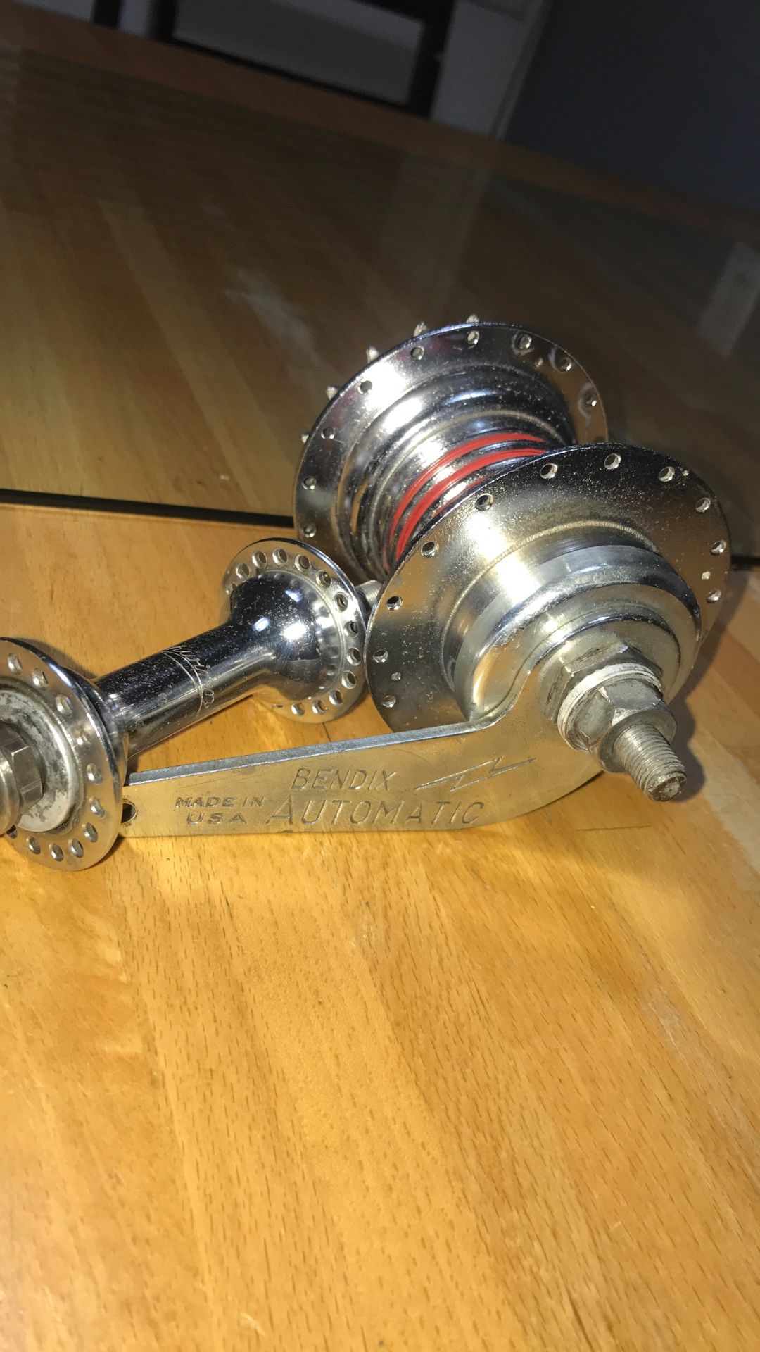 I have a beautiful set of Hubs straight off a beautiful condition Schwinn. Bendix Automatic 2 speed kick back red band 36h hub complete in great shape paired up with a front 36h Schwinn script hub also in beautiful condition. Both hubs will need fresh grease before riding. Please see photos for condition and details. Only asking $150 OBO local pick up in Long Beach