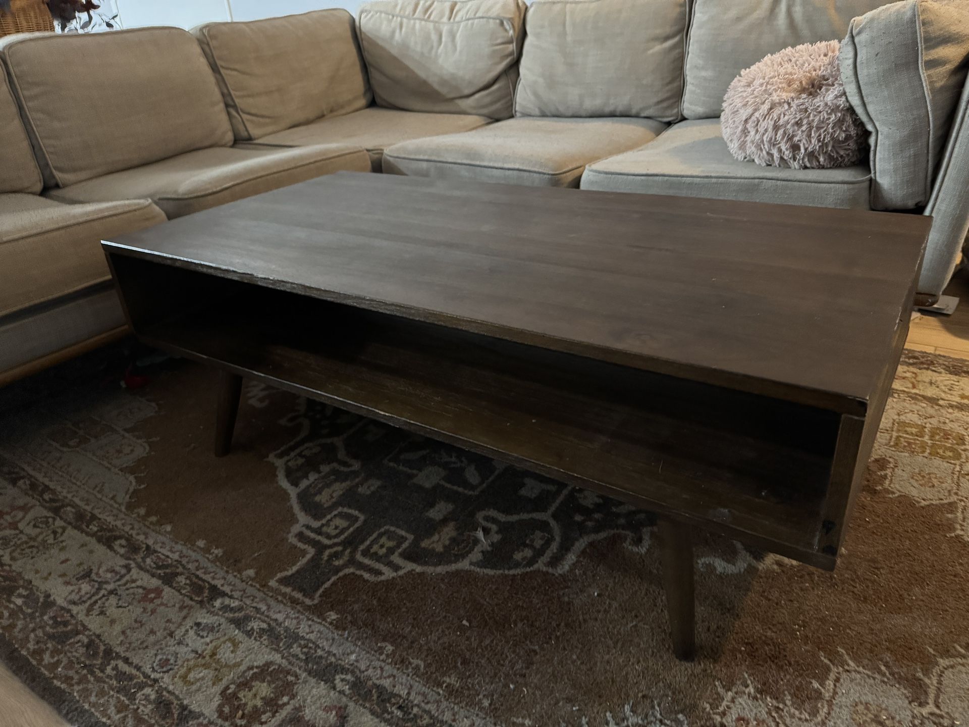Midcentury style coffee table - not solid wood, has slight chipping along edges that could use either some glue or a wood pen. 47.75” L, 23.75” W, 16.75” H.