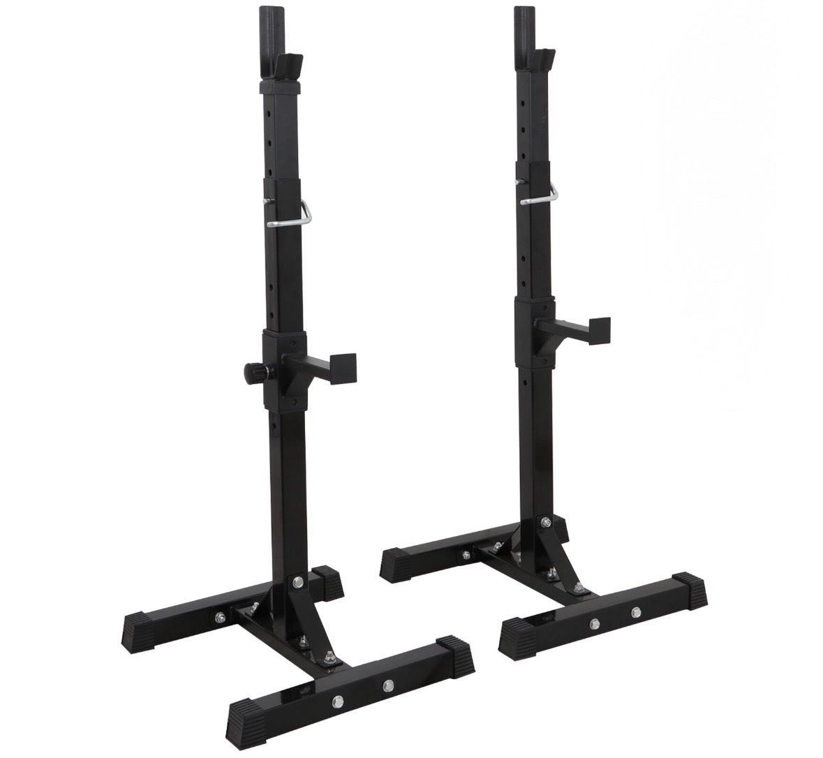 Brand new in box still wrapped in plastic Next Heavy Duty Construction: The solid steel material is designed to hold up to 550 pounds (250 KG) of weight. The 2" (50mm) steel tube frame ensures high quality for added safety and stability. • Safety Features: The sturdy "H" base and triangular structure prevent wobbling during workouts. Nonslip and abrasion-resistant rubber end caps firmly position the squat rack and protect the floor from damage. • Adjustable Height: The squat rack can be adjusted to 14 rack positions (5cm gaps) to suit your height, achieving better workout results. Height range from 40 to 66 inches (102 to 168 cm). • Multi-Purpose Use: Allows you to target a variety of muscle groups including arms, legs, waist, hips, and abdomen. Ideal for shoulder bench presses, squats, dips, overhead lifts, and more. Easy Installation: Designed for simple assembly to get you started on your workouts quickly. Full instructions and all mounting hardware are included.
