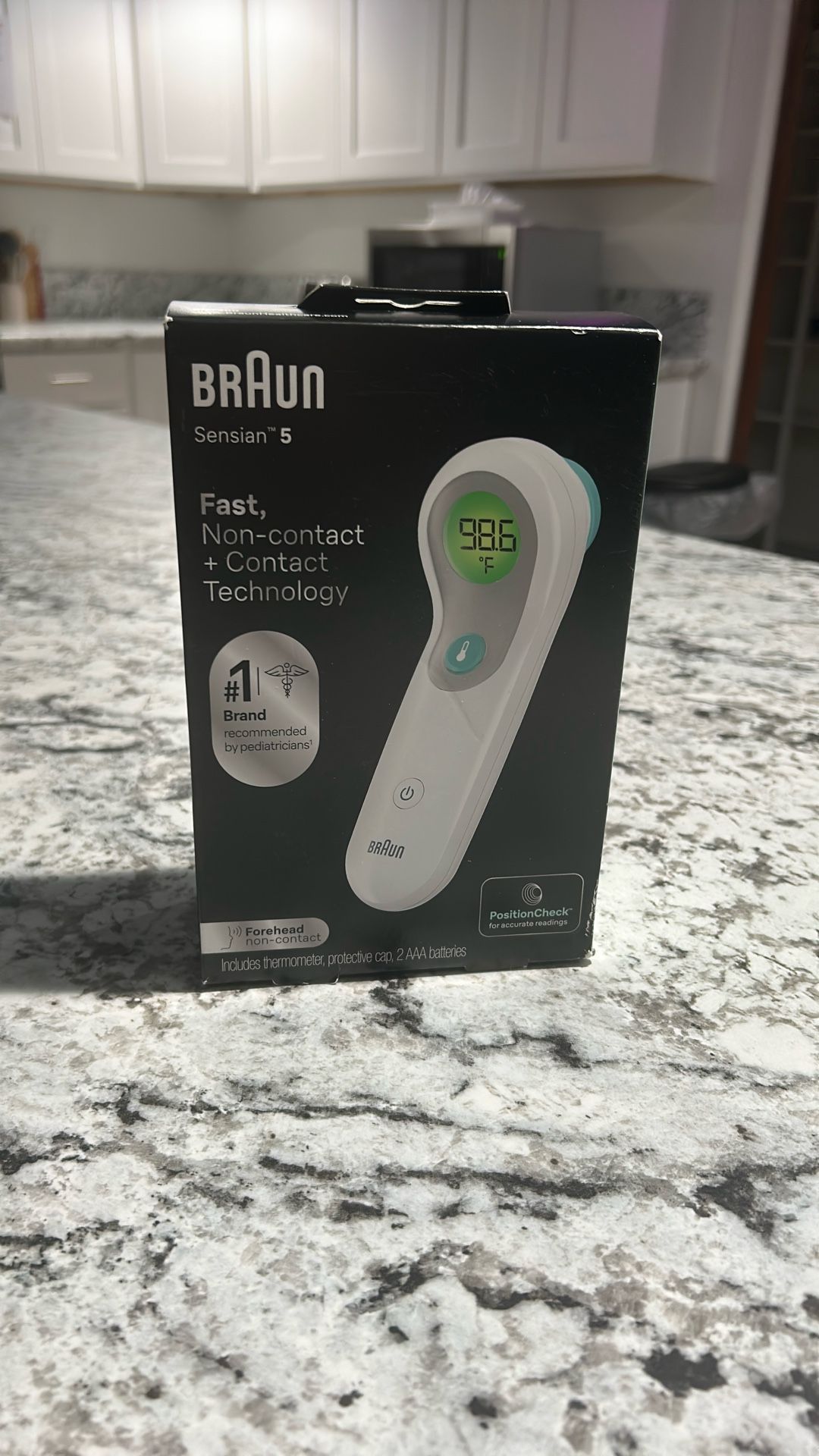 Brand new never opened. Retails for $80 Braun Sensian™ 5 non-contact forehead thermometer, model BNT300. Technology: Features non-contact technology allowing for readings from 2 inches away, as well as a touch mode. Accuracy: Includes a position check feature and color-coded fever guidance on the screen. Speed: Delivers readings in approximately 2 seconds. Included Items: The package contains the thermometer, a protective cap, and 2 AAA batteries.