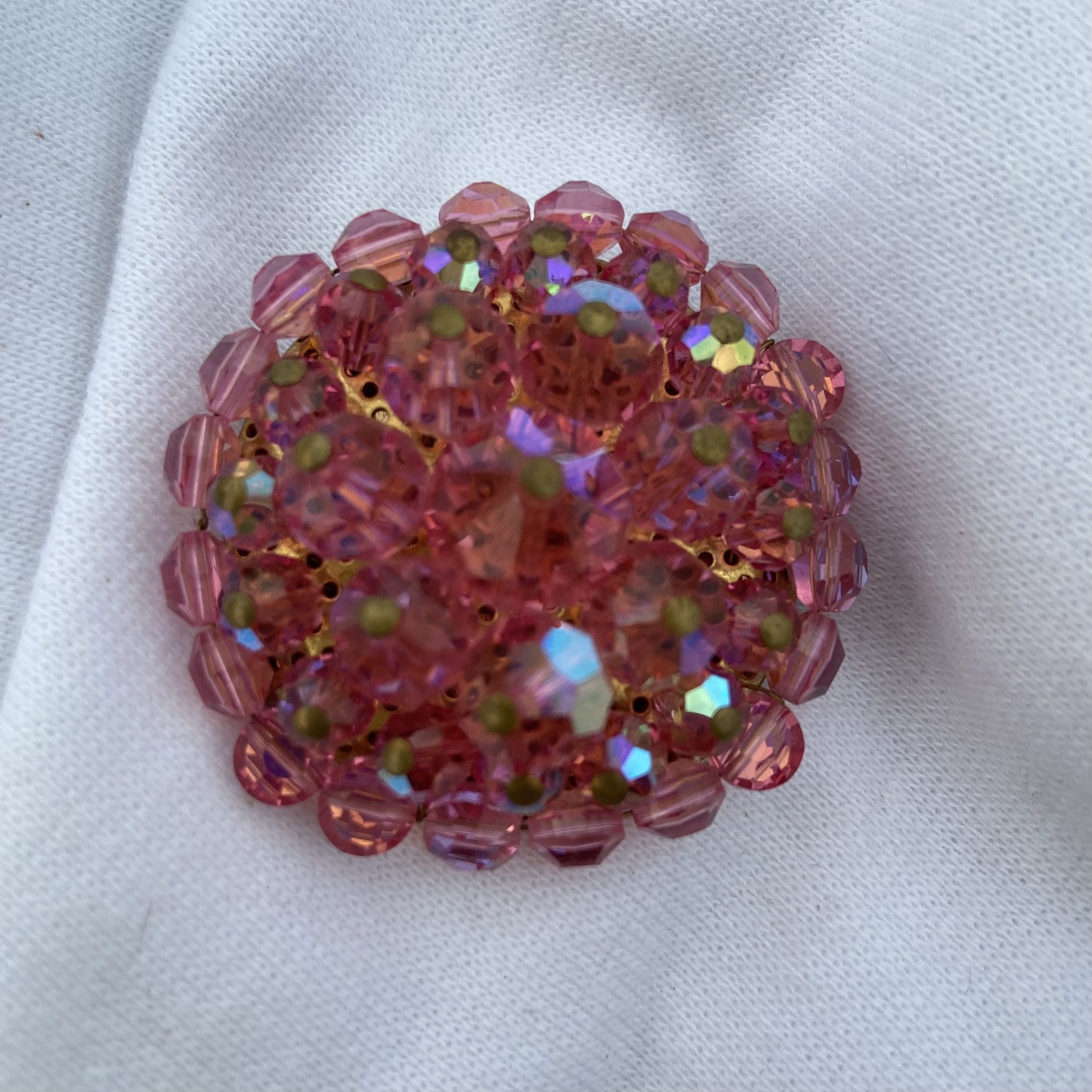 Vintage crystal brooch Pink aurora borealis finish on glass crystal beads 2 β round Antique Gold metal color Fantastic condition and color Feel free to make me an offer π