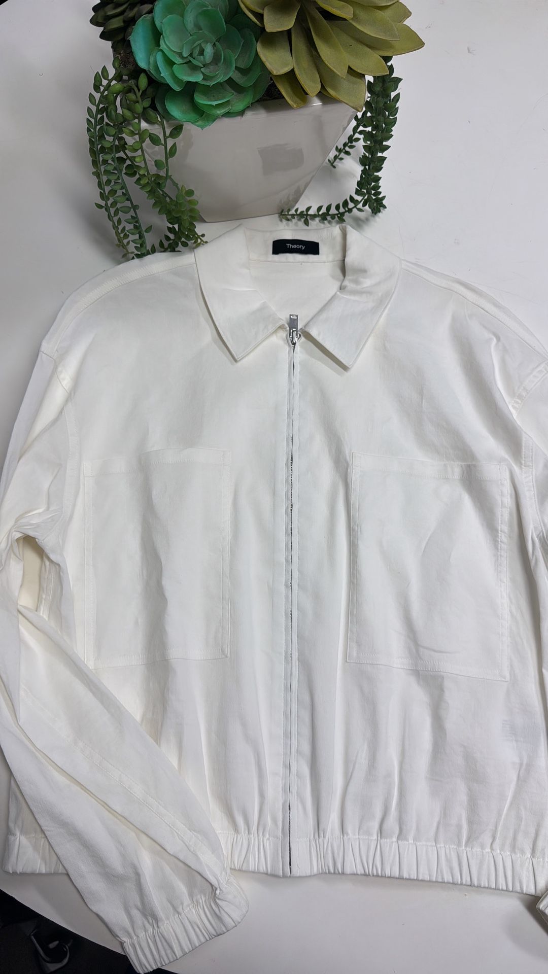Elegant ivory jacket by Theory. Features a sleek zip closure and refined design.