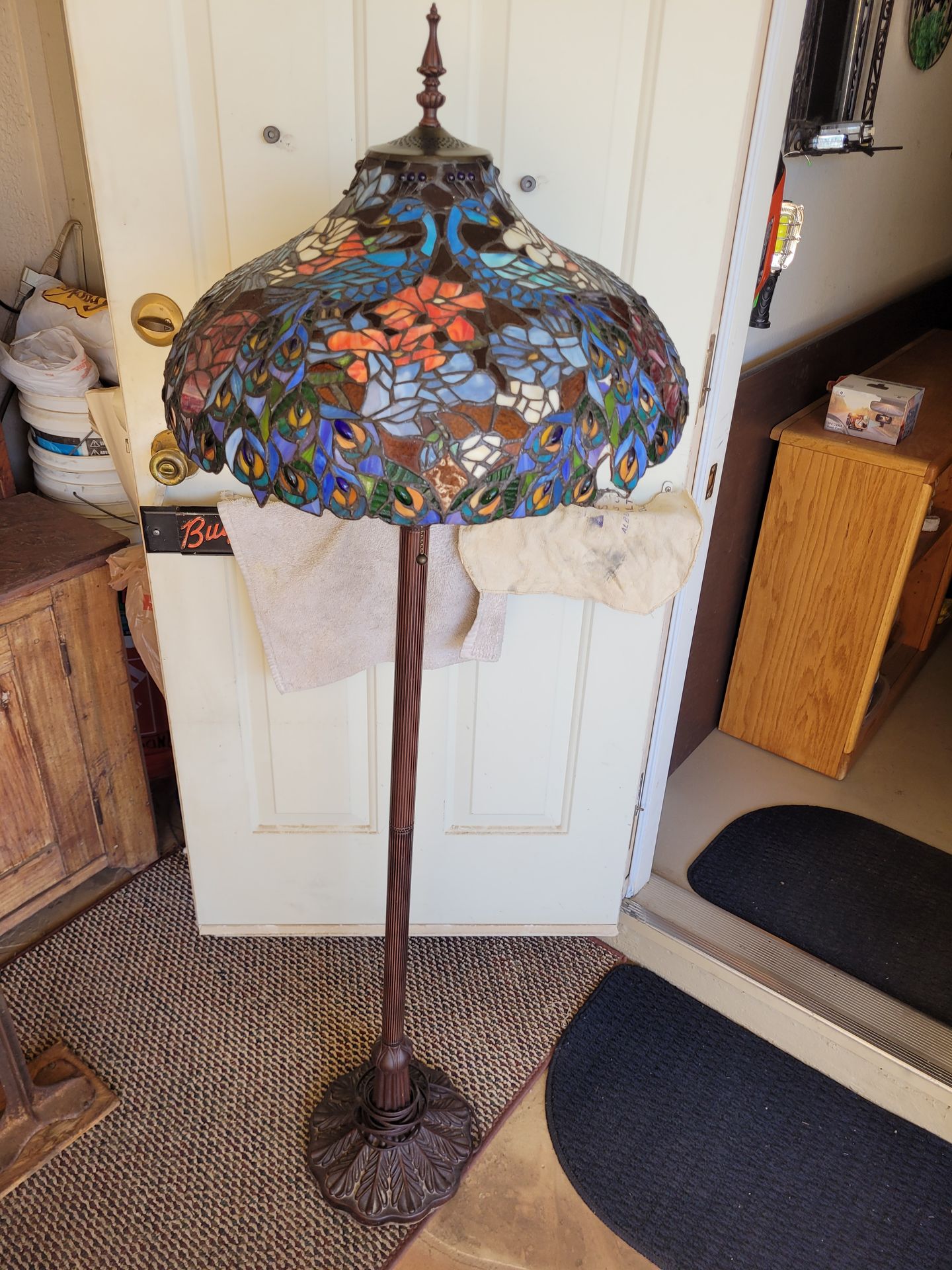 3 bulb stand, perfect Total height 57" . SHADE- appears to have fallen Over at one time & hit on one Side, 4 or 5 pieces broken out & missing, ( see pics) Shade- 18 " across × 10" tall. NOT a leaded shade.