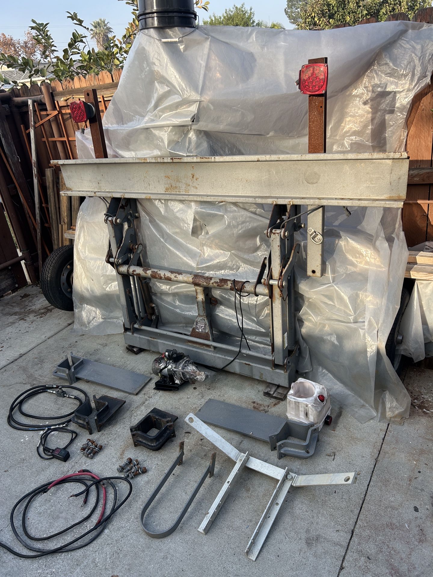 Hydralift Motorcycle Lift (motorcycle carrier) for RV Motorhomes, 2005 year model, and I’ve seen them on 5th wheel travel trailers. This lift was installed on my diesel pusher motorhome and was removed to work on the engine. After the engine was serviced my rig was rear ended and deemed a total loss by the insurance company; luckily I didn’t have a chance to install this lift otherwise it would have been totally destroyed. So, in the pictures you can see that the hydraulic pump was affected by the accident. This was the second pump that was installed to this lift so it was not the OEM. This pump is a single action pump with a solenoid pressure release. One more note to mention is that I used this lift for carrying any one of my handicap scooters or any one of my motorized wheelchairs; my motorized wheelchair weighs half as much as my fully dressed Harley Road Glide, back in the days of my riding years. I am handicap with limited mobility.