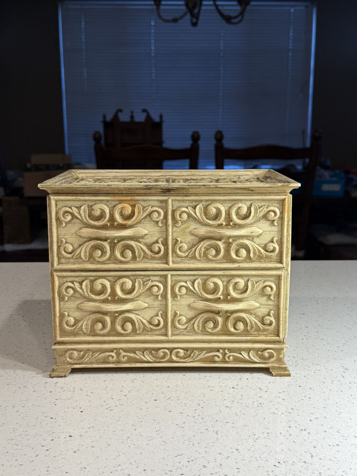 Vintage Lerner jewelry / keepsake box featuring detailed carved scroll design and a distressed cream finish with subtle gold accents. Marked on bottom: Lerner – Melville, L.I., New York. Interior is lined in red velvet and offers roomy storage for jewelry or small keepsakes. Details: • Maker: Lerner • Molded resin / plastic construction • Ornate scrollwork design • Red velvet interior • Decorative footed base Approximate Size: About 10” wide 9” tall 6” deep Condition: Vintage condition with visible age wear. Some discoloration on the front and the red velvet interior shows aging and wear. Structurally solid and fully functional. Please see photos for details. Perfect for: Vanity decor, cottagecore styling, French Provincial look, dresser storage, or as a decorative keepsake box.