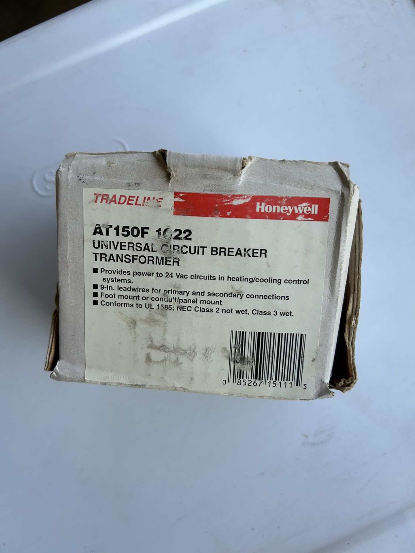 Selling a Honeywell AT150F1022 universal circuit breaker transformer. Box is a little worn from storage, but unit is unused. Specs: • 120/208/240V primary • 24V secondary • 50 VA output • Built-in circuit breaker with reset • Ideal for HVAC control systems Great for furnace/AC control circuits or as a replacement transformer.