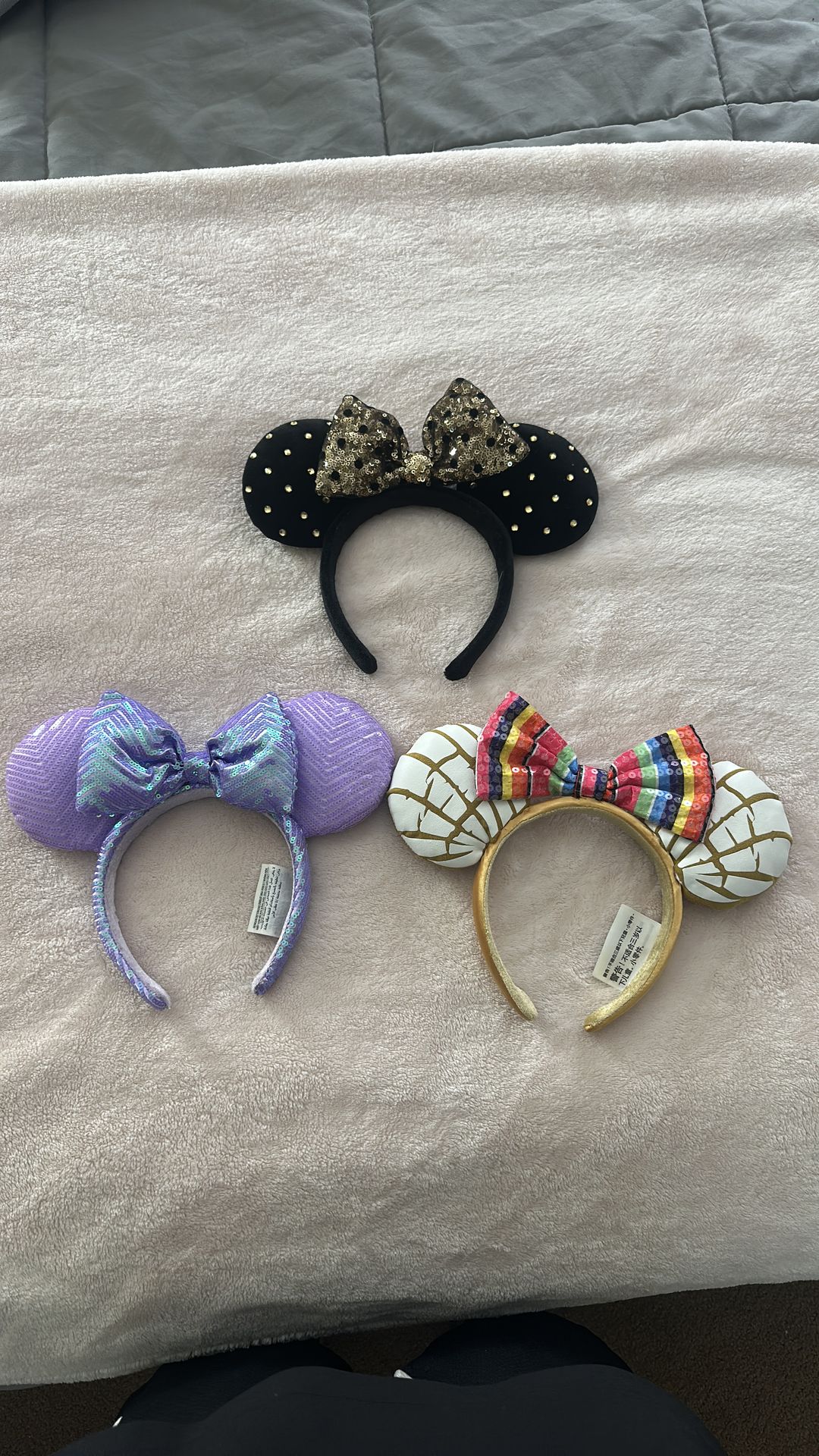 Selling a set of 3 authentic Disney Minnie Mouse ear headbands, each worn only once and in excellent condition. Perfect for your next trip to Disneyland Park or for any Disney fan! Included: • Black ears with gold polka dots and gold sequin bow • Purple iridescent sequin ears with matching bow • White/gold ears with colorful rainbow sequin bow All ears are clean, well kept, and like new. No stains or damage. Great for Disney trips, photos, collections, or gifts. Price: $25 for all 3 (or $10 each) Pickup: Local pickup available.