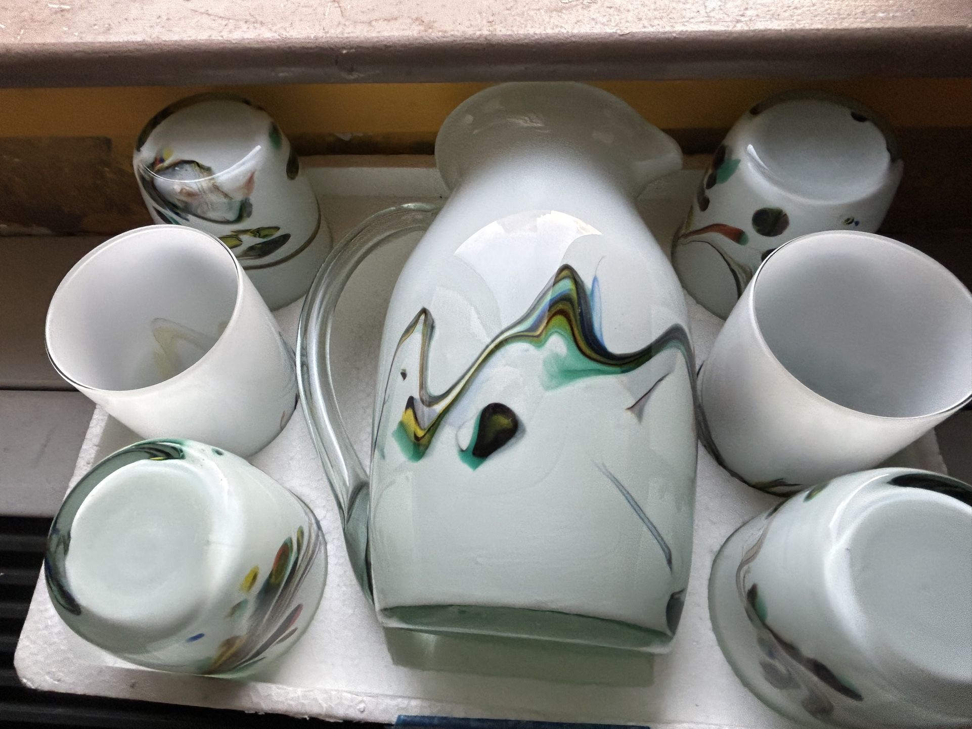 This set was never used in mint condition. White with multi colored swirls. Hand made from Italy. Pitcher and six glasses are all included in original packaging.