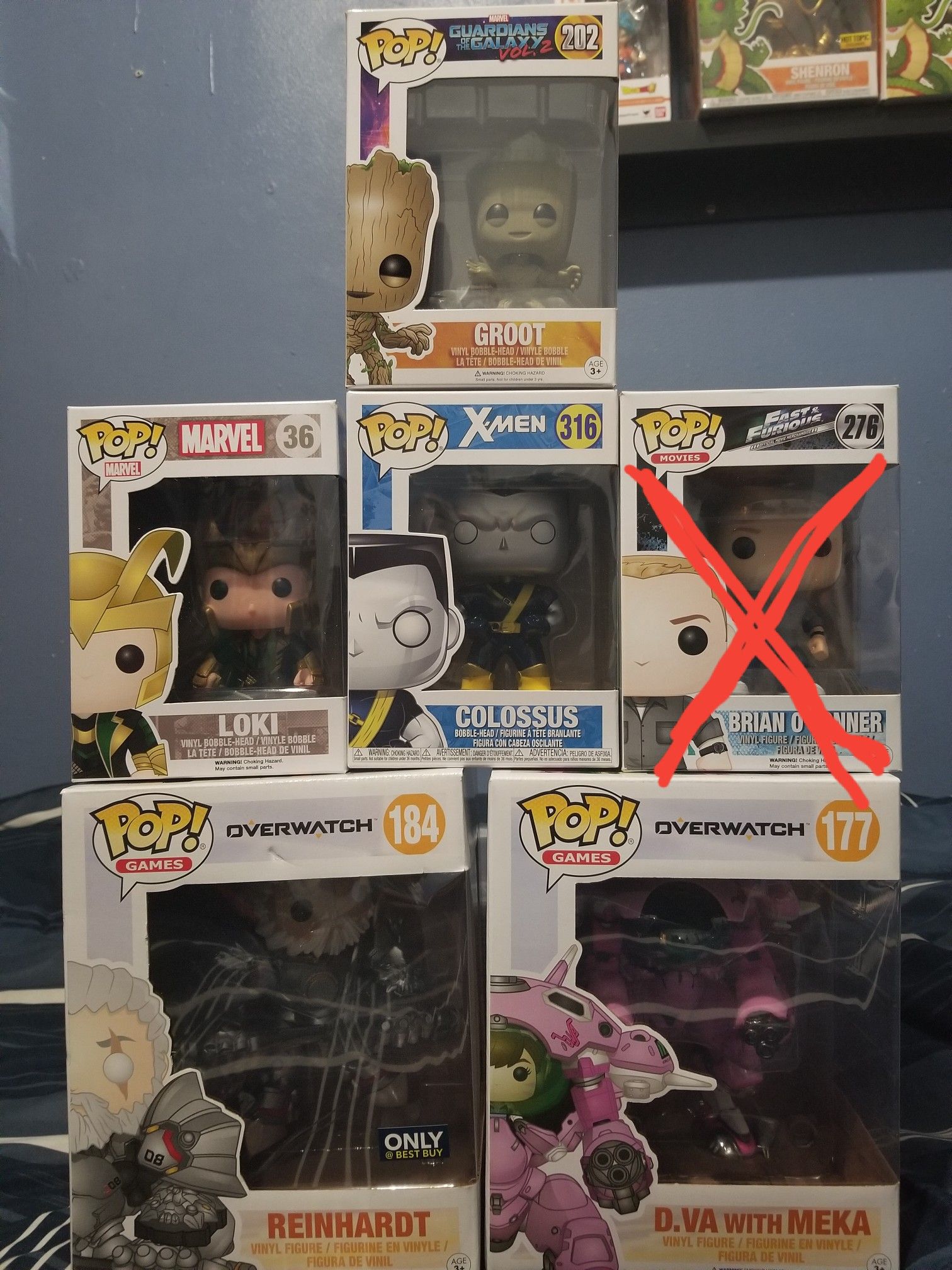 Funko pops for sale all in great condition. Only Reinhardt has minor scratch in front. Look at picture. Brian oconnor $8 (SOLD) Groot $8 Reinhardt $13 D.va with Meka $15 Loki $14 Colossus $15