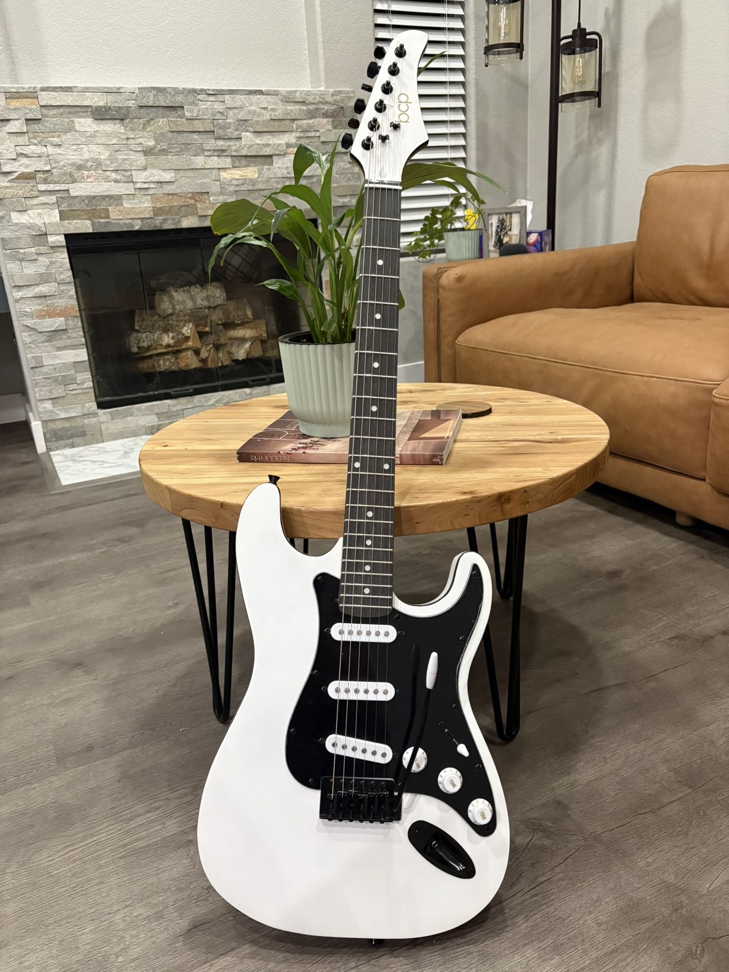 Used - New This new electric guitar features a sleek paint finish, black tuning pegs, and accented binding for a polished look. It’s custom-designed and handcrafted with a composite fretboard and maple neck, delivering a rich rock sound through 3 single-coil pickups, a tremolo bridge, and a removable matching whammy bar. Strings have been replaced with Ernie Ball Regular Slinky Nickel Wound Strings