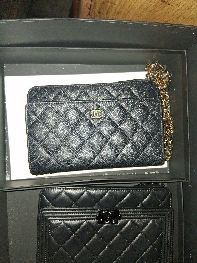 One is fully leather with a beautiful black chain and the other is a matted leather with a gold chain. $1500/ea
